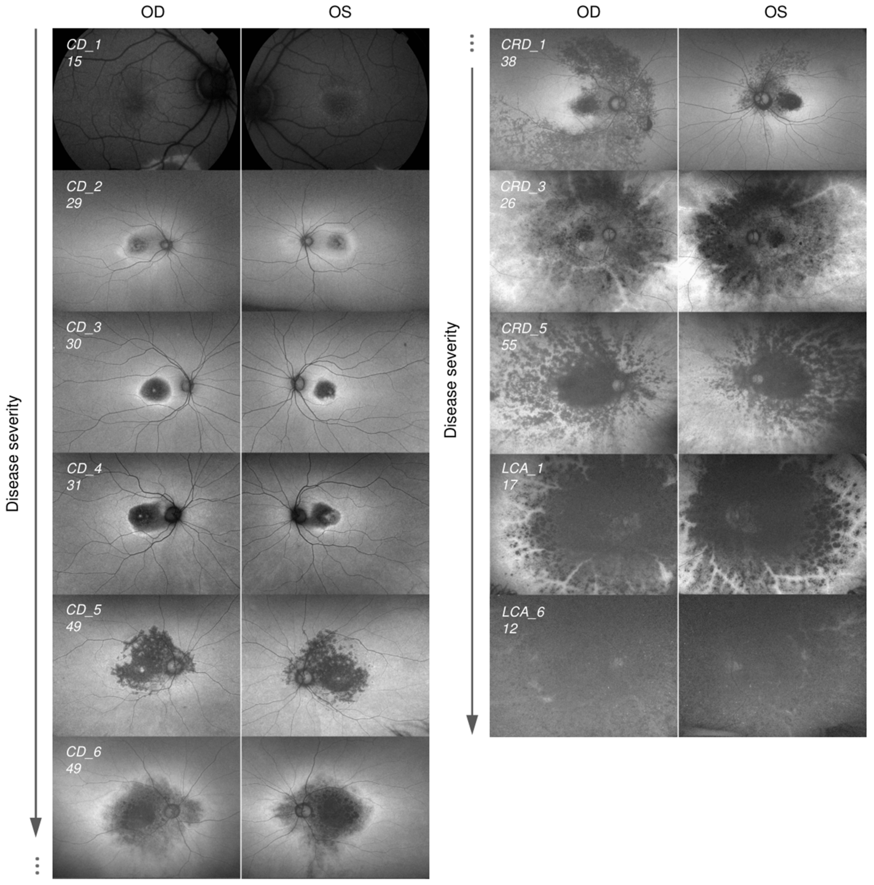 - Tsang, S.H.; Sharma, T. Progressive Cone Dystrophy and Cone-Rod Dystrophy (XL, AD, and AR). In Atlas of Inherited Retinal Diseases; Tsang, S.H., Sharma, T., Eds.; Springer International Publishing: Cham, Switzerland, 2018; pp. 53–60. ISBN 978-3-319-95046-4. [Google Scholar]