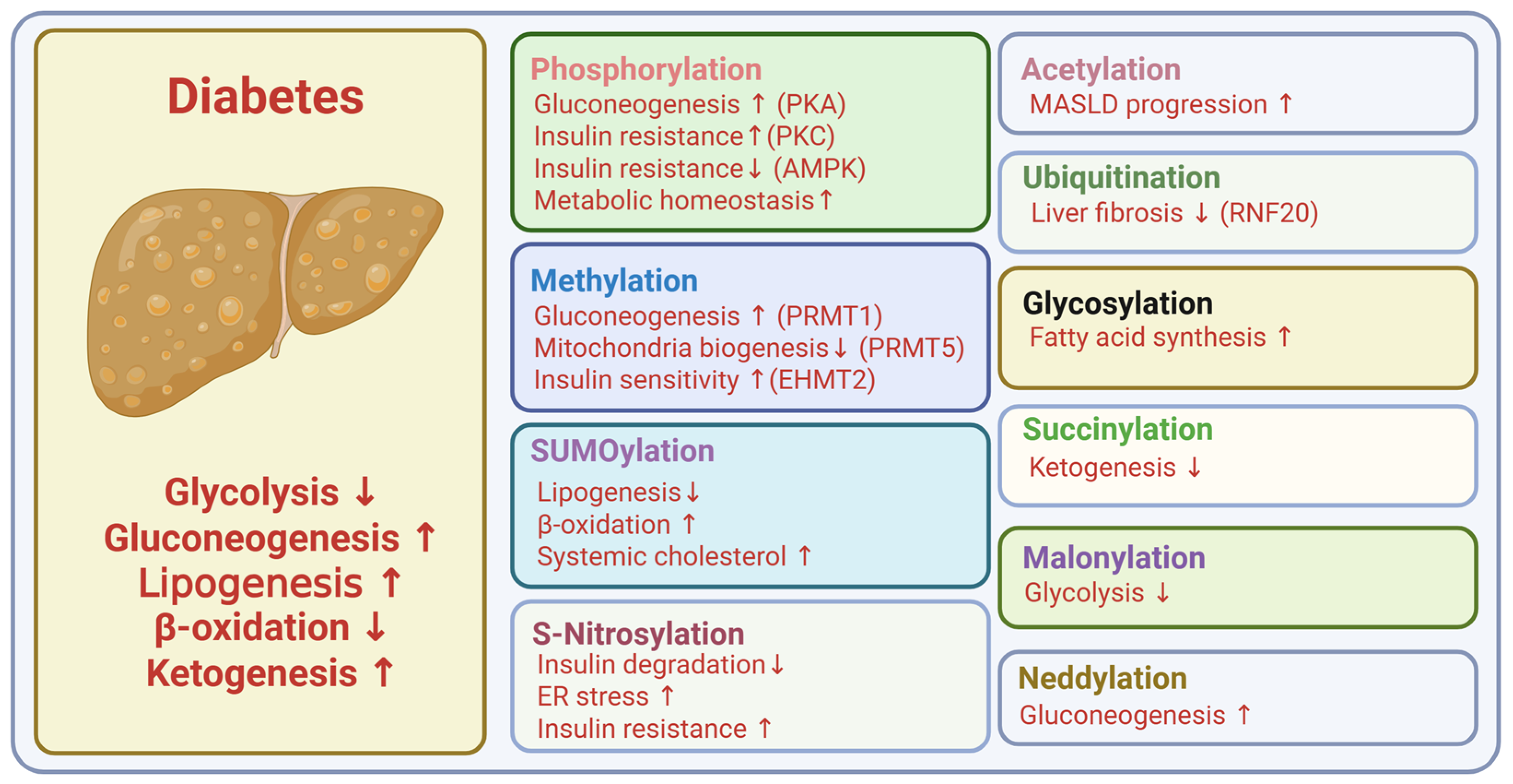 - Yang, Y.H.; Wen, R.; Yang, N.; Zhang, T.N.; Liu, C.F. Roles of protein post-translational modifications in glucose and lipid metabolism: Mechanisms and perspectives. Mol. Med. 2023, 29, 93. [Google Scholar] [CrossRef]