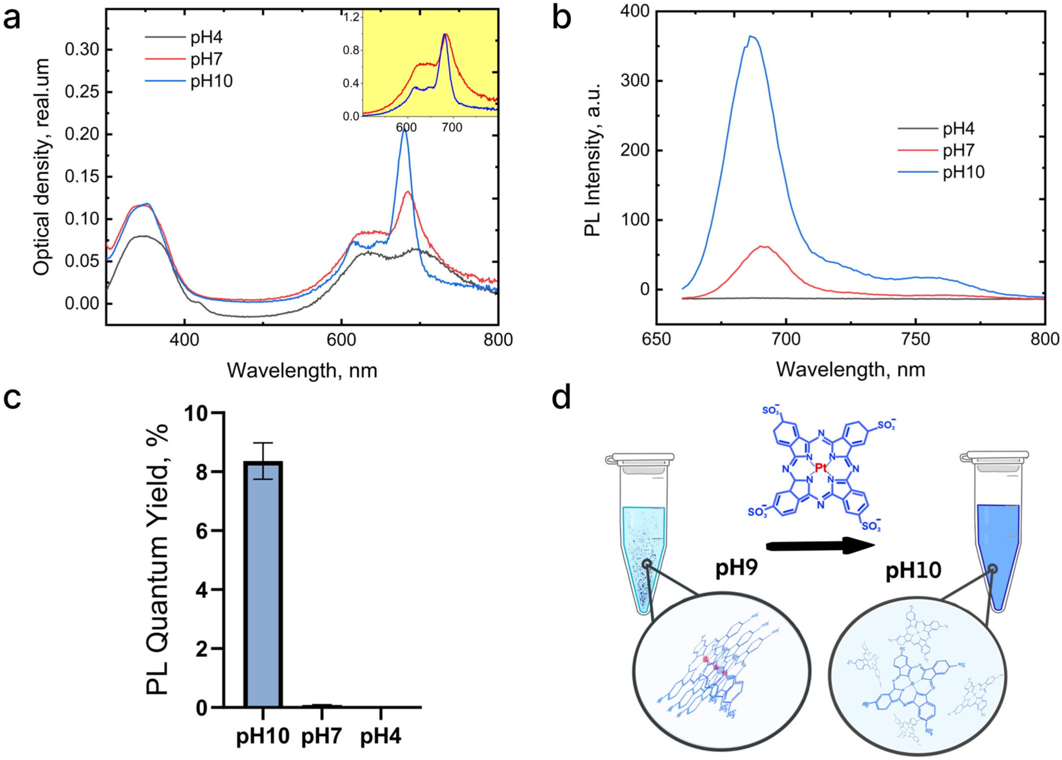 As shown in Figure 1, the absorbance and fluorescence spectra of platinum sulfonated phthalocyanine (Pc) align with the electronic structure typical of other phthalocyanines and exhibit strong dependence on environmental pH. The absorption spectra feature two characteristic bands at 640 nm and 350 nm (Figure 1a), with the shape of the 640 nm band demonstrating significant pH sensitivity (inset, Figure 1a). The fluorescence spectrum is characterized by a peak at 680 nm and a quantum yield of approximately 10% at alkaline pH (Figure 1b,c). When the pH decreases from 10 to physiological pH (~7), the fluorescence quantum yield drops sharply from 8% to 0.2% (Figure 1c). This pH-dependent variation in optical properties is common for molecules in this class and is typically associated with aggregation of the sensitizer molecules (Figure 1d).