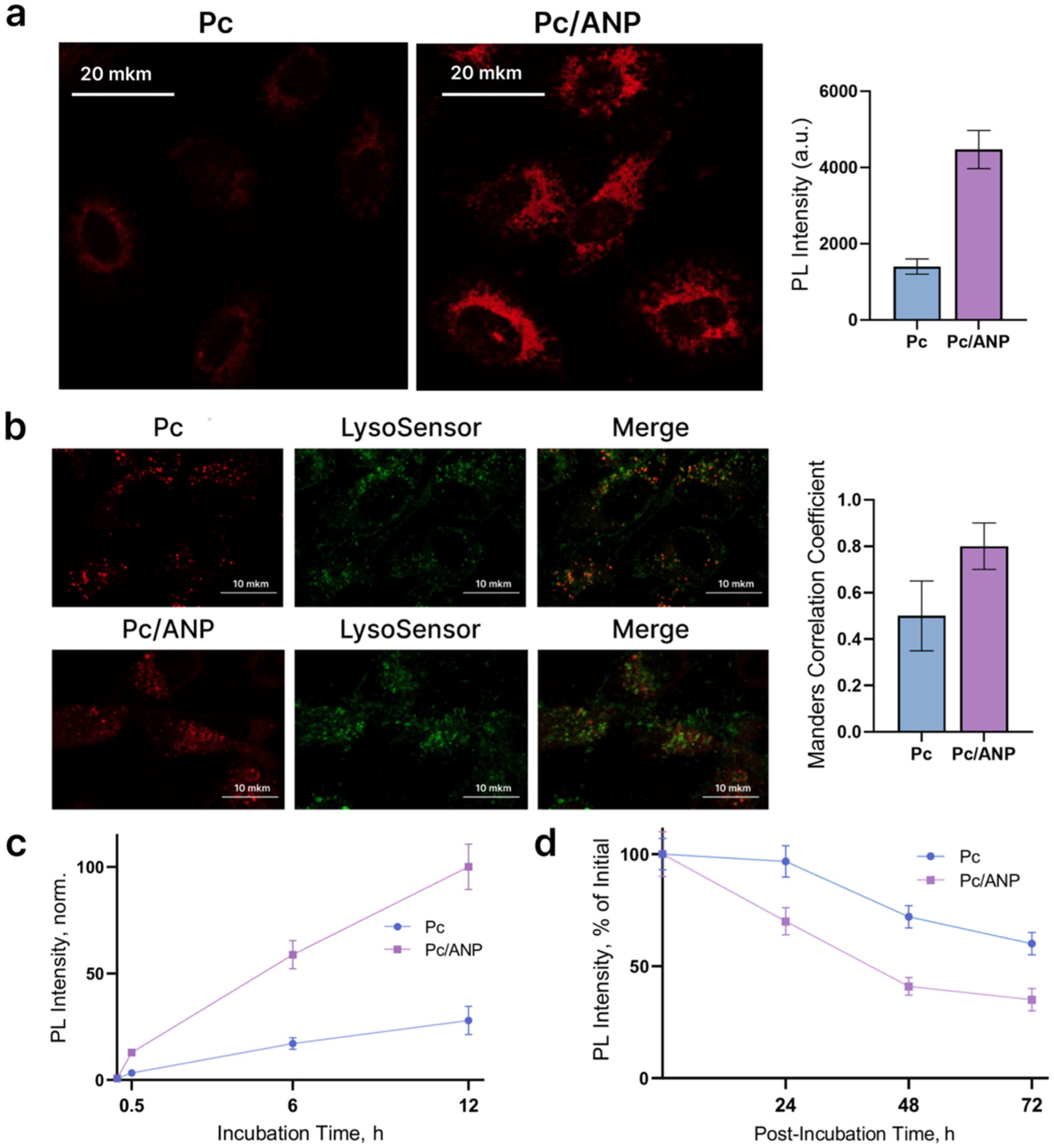Figure 3. Internalization of Pc/ANP systems by SKBR-3 cells: (a) luminescence (PL) signal of Pc observed 12 h after cell treatment with free Pc and Pc/ANP systems. Scale bars indicate 20 µm; (b) localization of free and encapsulated Pc in lysosomes after 12 h of treatment (Pc—red, lysosomes—green, and colocalization—yellow in the merged channel. Scale bars indicate 10 µm. The histogram presents the corresponding Manders’ coefficient (tM1) values; (c) internalization kinetics and (d) release kinetics of free and encapsulated Pc measured by flow cytometry, represented as mean fluorescence intensity over time. In all experiments, the Pc concentration was 0.01 ng per cell.