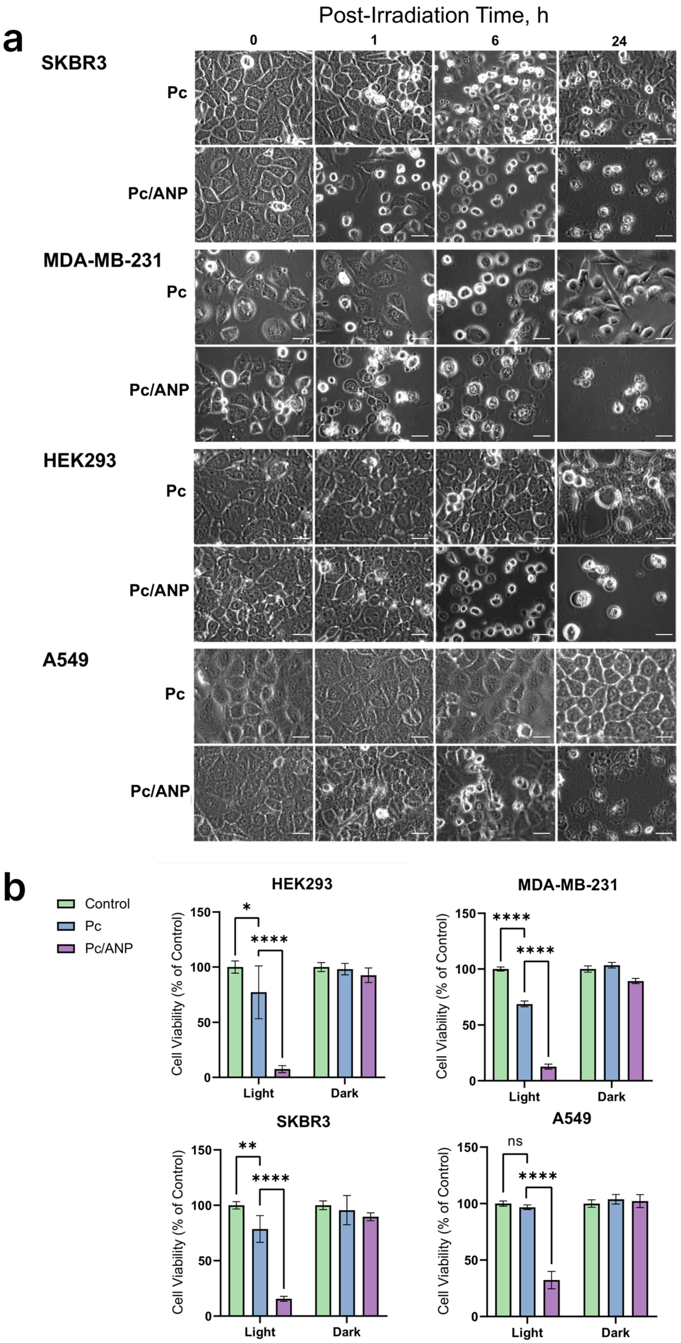 Figure 4. Effects of Pc/albumin nanoparticle (ANP) systems on A549, SKBR-3, HEK293, and MDA-MB-231 cells: (a) Morphological changes in cell cultures treated with free and encapsulated Pc, observed without irradiation and at 1, 6, and 24 h post-irradiation. Scale bars represent 20 µm (b) cell viability assessed 24 h after irradiation of cells treated with free and encapsulated Pc. Fluence of irradiation was 0.7 J/cm2. Results are presented as mean ± standard deviation (SD). Statistical significance was determined using one-way ANOVA followed by Dunnett’s test, with, * = p < 0.1, ** = p < 0.01, and **** = p < 0.0001. The Pc concentration was maintained at 0.01 ng per cell in all experiments.