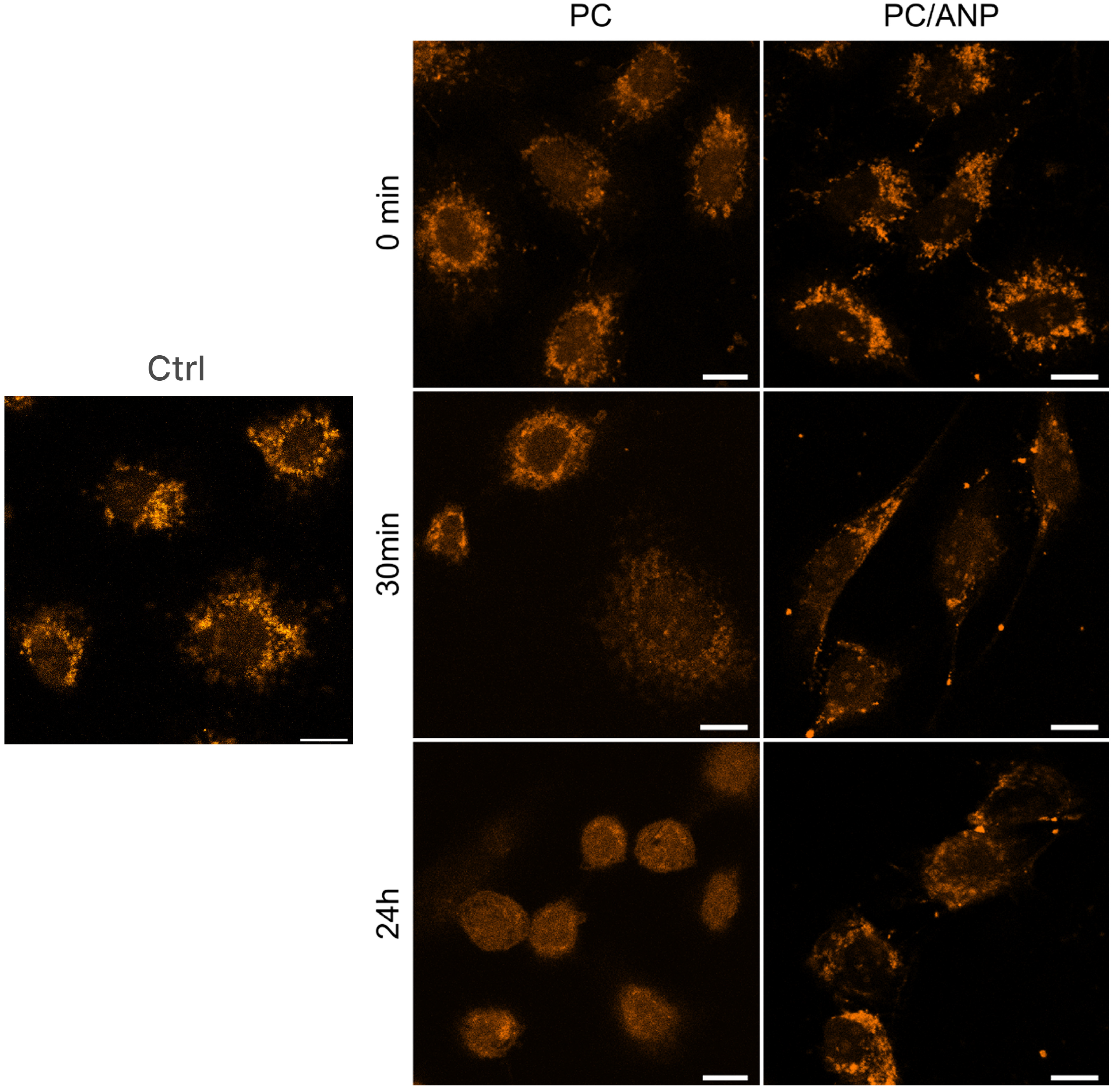 Figure 5. The effect of Pc/ANP systems on the mitochondrial reactive oxygen species (ROS) levels in SKBR-3 cells was assessed by confocal microscopy using LumiTracker Mito Orange CMTMRos at 30 min and 24 h post-irradiation. Fluence of irradiation was 0.7 J/cm2. Scale bars represent 10 µm.
