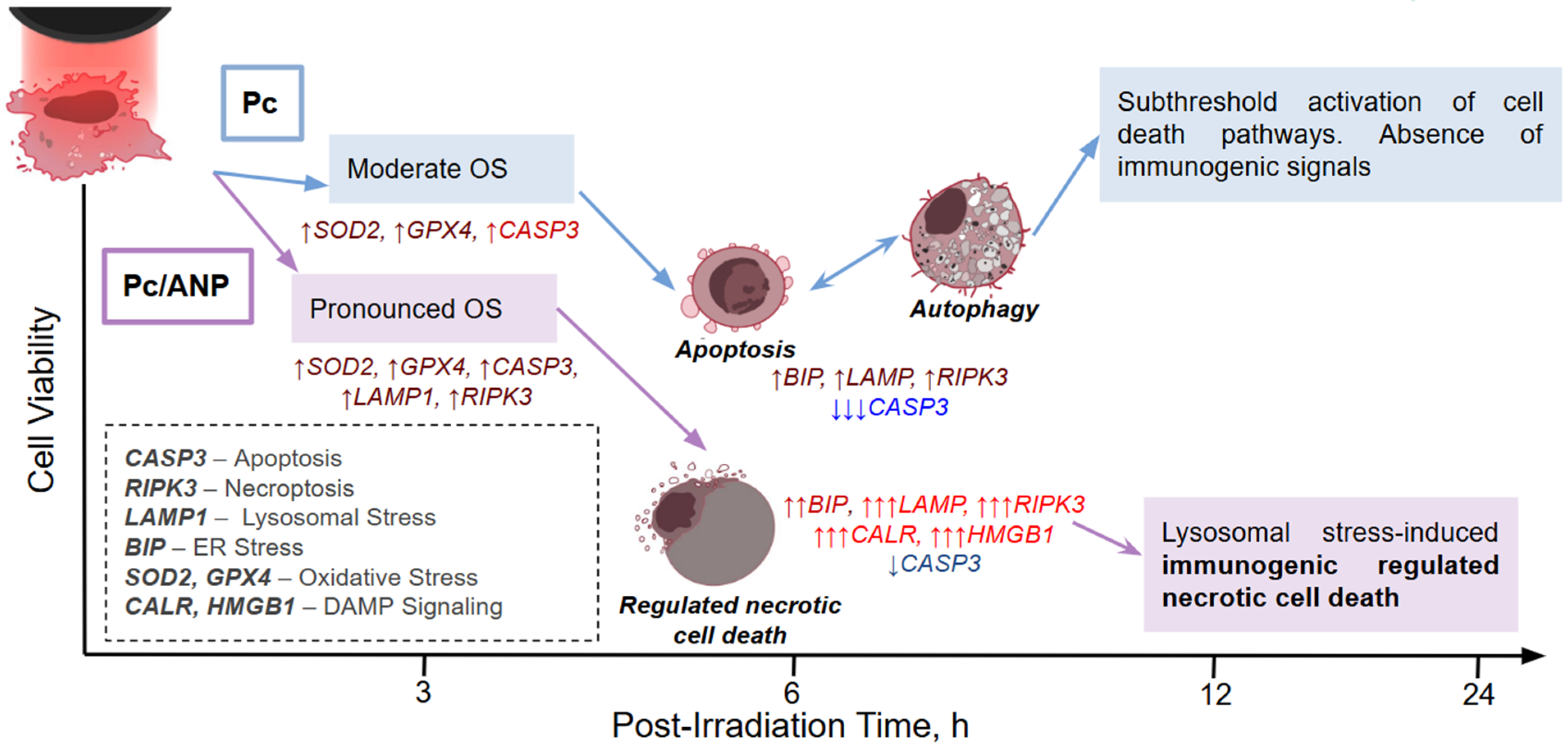 Figure 7. Schematic representation of the kinetics of various cell death markers induced by PDT with Pc. The dependence of the cell death mechanism on the encapsulation of the Pc within ANPs. Arrows indicate the dynamics (increase/decrease) and the magnitude of changes in gene expression.