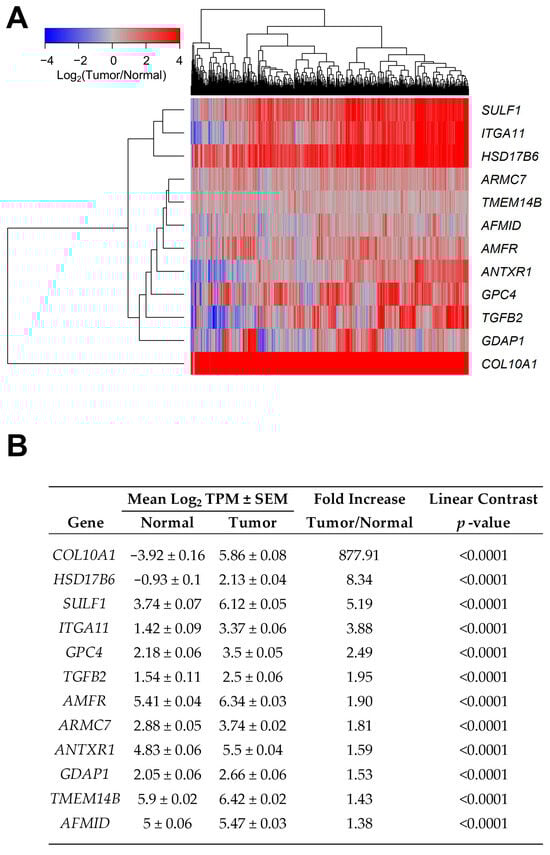 In our first screen, we sought to identify TGFB2-dependent Gene2 effects that exhibited significant HR calculations for TGFB2 mRNA expression (p < 0.05) AND Gene2 expression (p < 0.05) AND TGFB2 by Gene2 interaction terms (p < 0.05) (Figure 1; 11 Gene2 upregulated in tumors). Expression of collagen type x alpha 1 chain (COL10A1) mRNA exhibited a significant (p < 0.0001) 877.9-fold change in tumor compared with normal tissue; this high value for fold change was a result of the very low expression of COL10A1 in normal tissue (mean ± SEM = −3.92 ± 0.16 log2TPM (transcripts per million)). Three genes showed a greater than 3-fold increase in expression in tumors compared with normal tissue: integrin subunit alpha 11 (ITGA11), sulfatase 1 (SULF1), and hydroxysteroid 17-beta dehydrogenase 6 (HSD17B6), all with p < 0.0001 (Figure 1B).
