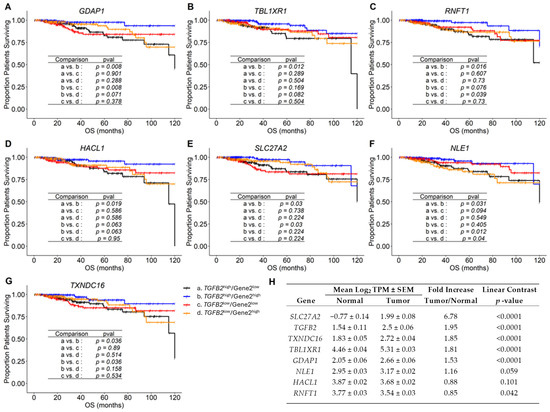 We next focused on Gene2 expression that exhibited positive prognostic impact in combination with TGFB2 mRNA expression from the list of 380 Gene2s that showed significant interaction parameters from the multivariate Cox proportional hazards models (Table S2). Seven Gene2s: GDAP1, TBL1X/Y related 1 (TBL1XR1), ring finger protein, transmembrane 1 (RNFT1), 2-hydroxyacyl-CoA lyase 1 (HACL1), solute carrier family 27 member 2 (SLC27A2), notchless homolog 1 (NLE1), and thioredoxin domain-containing 16 (TXNDC16) showed significant improvements in OS outcomes when comparing TGFB2high/Gene2high versus TGFB2high/Gene2high-expressing cohorts of patients using a Kaplan–Meier analysis; this was shown by separation for two arms of the four survival curves (p < 0.05), whereby high levels of TGFB2 and Gene2 mRNA expression resulted in the most improved OS outcomes (Figure 2, Table S3). Calculation of the multivariate parameters for these seven Gene2 reported p-values for the interaction term ranging from 0.004 to 0.036 (Table S2). Kaplan–Meier analysis of patient cohorts with above median expression of TGFB2 and GDAP1 mRNA (n = 181; p = 0.0084, Figure 2A); TBL1XR1 mRNA (n = 222; p = 0.0121, Figure 2B); RNFT1 mRNA (n = 190; p = 0.0164, Figure 2C); HACL1 mRNA (n = 184; p = 0.0188, Figure 2D); SLC27A2 mRNA (n = 177; p = 0.03, Figure 2E); NLE1 mRNA (n = 196; p = 0.031, Figure 2F); and TXNDC16 mRNA (n = 185; p = 0.036, Figure 2G) showed significantly improved survival outcomes than patients cohorts expressing high mRNA levels of TGFB2 and low levels of Gene2 (Figure 2, Table S3). Four of these genes were significantly upregulated in tumor tissues (p < 0.0001 for all comparisons) (Figure 2H): SLC27A2, TXNDC16, TBL1XR1, and GDAP1.