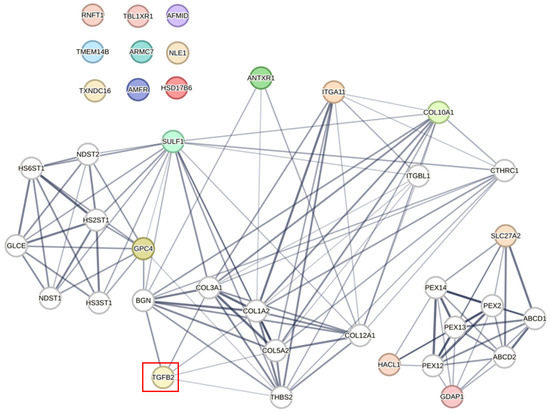 Protein–protein associations identify potential links of TGFB2 to the TGFB2-dependent Gene2 having prognostic impact in breast cancers. We integrated data from two screens analyzing TGFB2-dependent Gene2 (Figure 1 and Figure 2) to identify linker proteins, represented as white nodes, that connect TGFB2 (indicated by a red box) with the Gene2 (depicted as colored proteins) using the STRING database. The edges represent the confidence levels of each association, which are based on a combination of experimental evidence, including text mining, laboratory experiments, curated databases, co-expression analysis, neighborhood proximity, gene fusion events, and co-occurrence data. Protein associations were defined by interaction edge scores above 0.4, with line thickness indicating score thresholds at 0.4, 0.7, and 0.9. TGFB2 was associated with the network of GPB4, SULF1, ANTXR1, ITGA11, and COL10A1 via linker proteins via second shell interactors: BGN, COL3A1, COL1A2, COL5A2, and THBS2. A separate cluster of associations consisted of GDAP1, HACL, and SLC27A2. The 2 clusters represented Gene2 that exhibited differential impact on the OS derived from the multivariate Cox proportional hazards model, as distinguished by the HR values for Gene2. The cluster consisting of GPC4, SULF1, ANTXR1, ITGA11, and COL10A1 showed increases in the HR, whereas the cluster consisting of HACL, GDAP1, and SLC7A2 showed decreases in the HR. Red box highlights position of the TGFB2 protein.