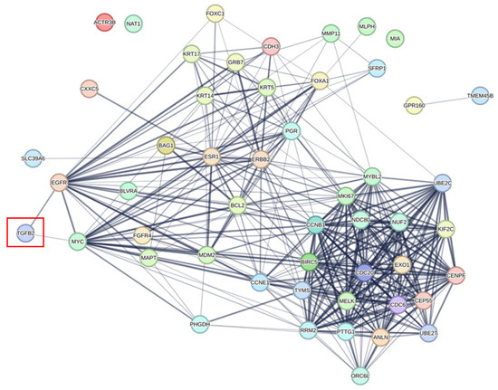 Protein–protein associations identifying potential links of TGFB2 to the PAM50 gene signature. We utilized the STRING database to identify the association of TGFB2 with the PAM50 gene signature. The edges illustrate the confidence levels of each association, which are based on a combination of experimental evidence, such as text mining, laboratory experiments, curated databases, co-expression analysis, neighborhood proximity, gene fusion events, and co-occurrence data. TGFB2 was associated with the network of the PAM50 gene signature via MYC and EGFR. Red box highlights the TGFB2 protein.