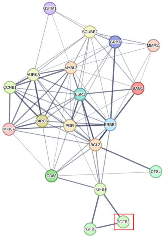 Protein–protein interactions identify potential correlations between TGFB2 and the OncotypeDx gene signature. We utilized the STRING database to identify the association of TGFB2 with the OncotypeDx gene signature. The edges represent the confidence levels of each association, which are based on a combination of experimental evidence, including text mining, laboratory experiments, curated databases, co-expression analysis, neighborhood proximity, gene fusion events, and co-occurrence data. TGFB2 was associated with the network of the OncotypeDX gene signature via TGFB1 associations with CD68, PGR, ESR1, BCL2, and ERBB2 proteins. Red box highlights the TGFB2 protein.