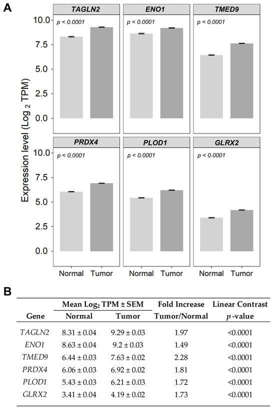 We cross-referenced the 41 genes identified in the TCGA dataset with those reported in the KMplotter database to narrow down the potential list of prognostic markers using more stringent criteria, comparing only median cut-off values for high- versus low-expressing patient subsets. This analysis identified six significantly upregulated genes in breast cancer tumor tissues cross-referenced in both the TCGA and KMplotter datasets (Figure 6). A significant increase in mRNA expression levels was observed in tumor tissue compared with normal tissue for the following genes: TAGLN2 (2-fold, p < 0.0001), ENO1 (1.49-fold, p < 0.0001), GLRX2 (1.73-fold, p < 0.0001), PLOD1 (1.72-fold, p < 0.0001), PRDX4 (1.81-fold, p < 0.0001), and TMED9 (2.28-fold, p < 0.0001) (Figure 6B).