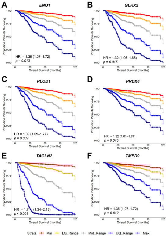 Expression of six genes (ENO1, GLRX2, PLOD1, PRDX4, TAGLN2, and TMED9) was identified to be significantly upregulated in tumor tissues, exhibiting an increase in HR on breast cancer patients analyzed in the TCGA dataset using the multivariate Cox proportional hazards model and validated in an independent KMplotter dataset.