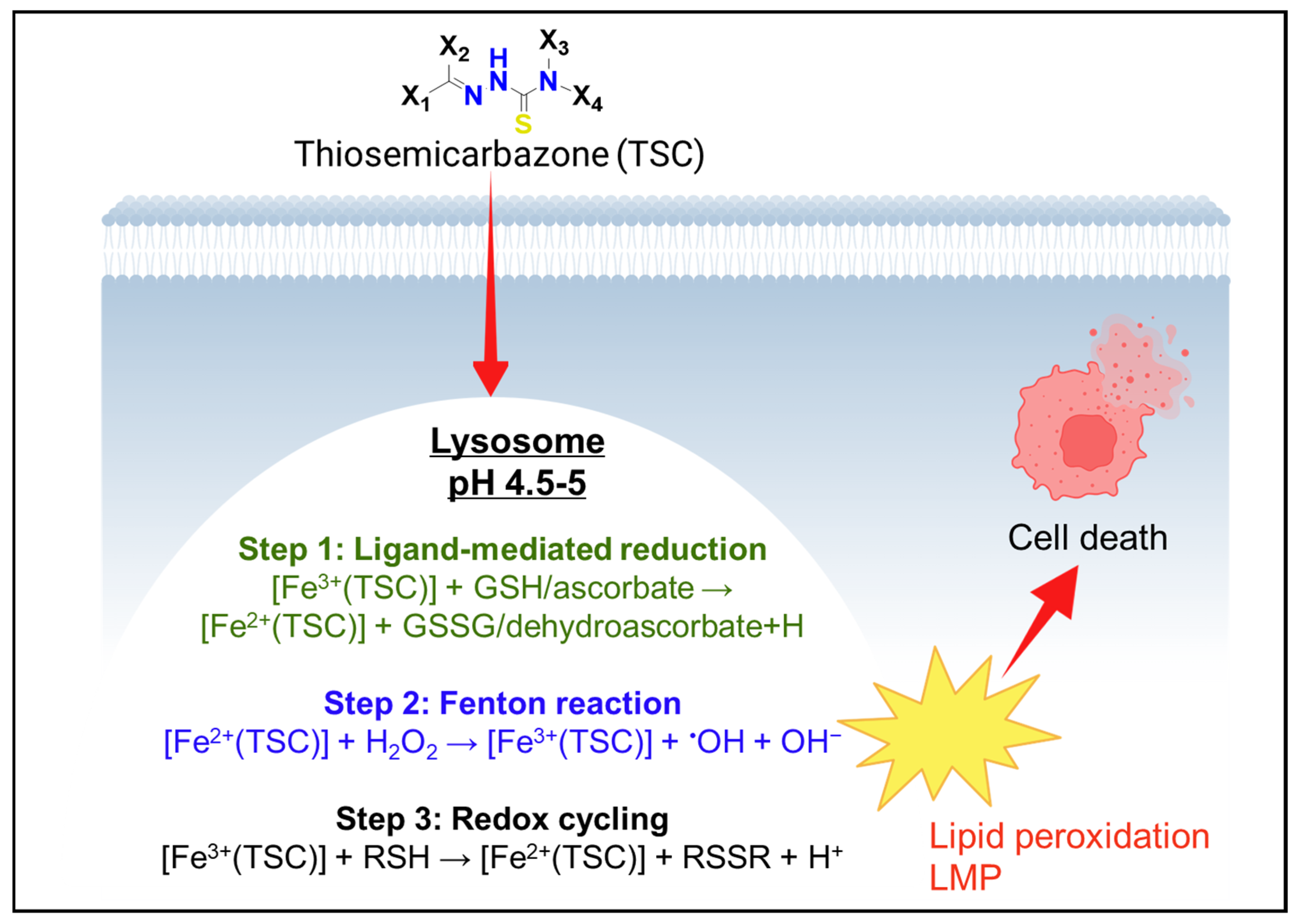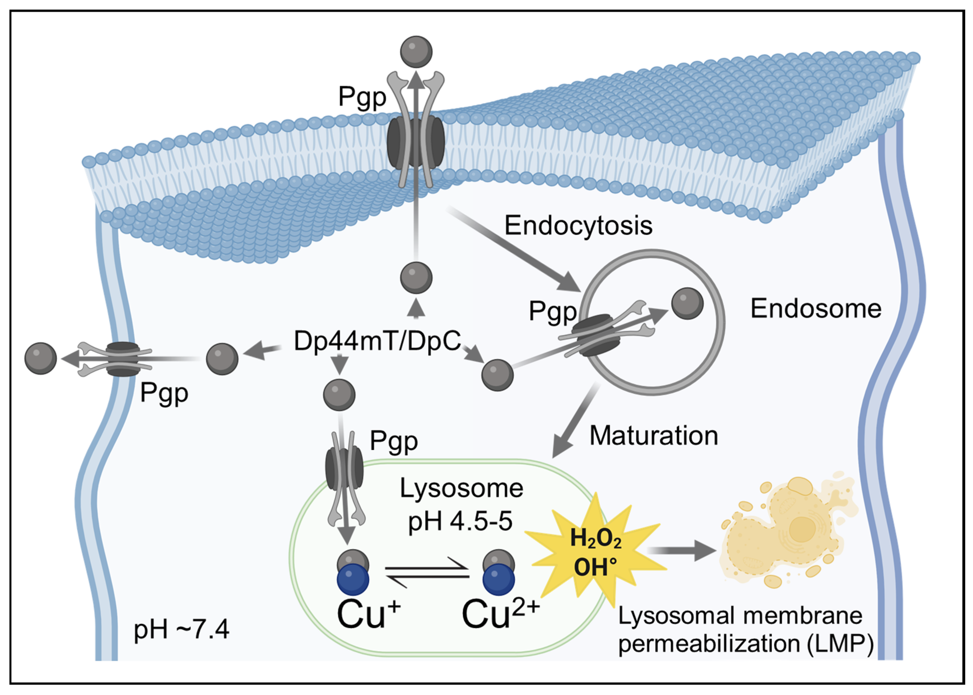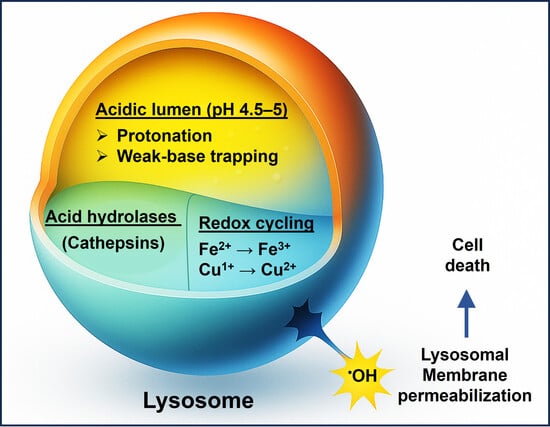 | Metal-Based Lysosomal Drugs | Redox-active metal complexes generate ROS | Cu(II)– or Au(III)–thiosemicarbazones | Induce lysosomal oxidative damage |