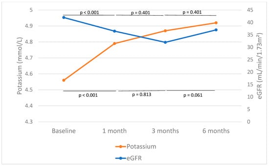 The first analysis included the whole group with 1 month of follow-up, during which time eGFR dropped from 49.49 [33.50–60.50] to 44.80 [28.25–58.00] mL/min/1.73 m2 (p < 0.001). The subgroup analysis with 6 months of follow-up revealed an initial eGFR drop at 1 month, from 42 [27.75–58.25] to 36.50 [23.75–53.00] mL/min/1.73 m2 (p < 0.001) (Figure 2, Table 2). No significant differences were observed when compared to the values at 3 months (p = 0.401) or 6 months (p = 0.371), suggesting stabilization of renal function following the initial eGFR drop (Figure 2).