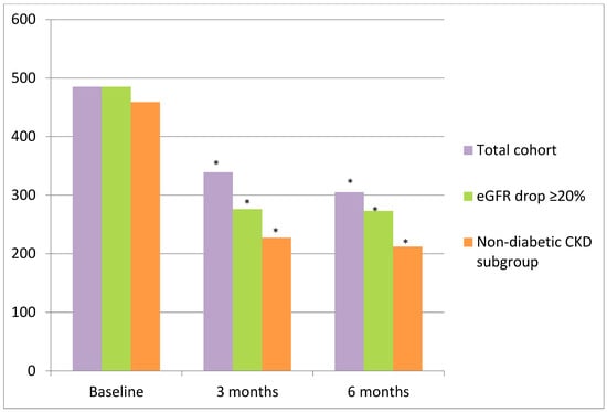Evolution of albuminuria after finerenone initiation in the total cohort, subgroup with eGFR drop > 20%, and non-diabetic CKD subgroup. Percentage in red represents the change in UACR from baseline. (*) p < 0.05.