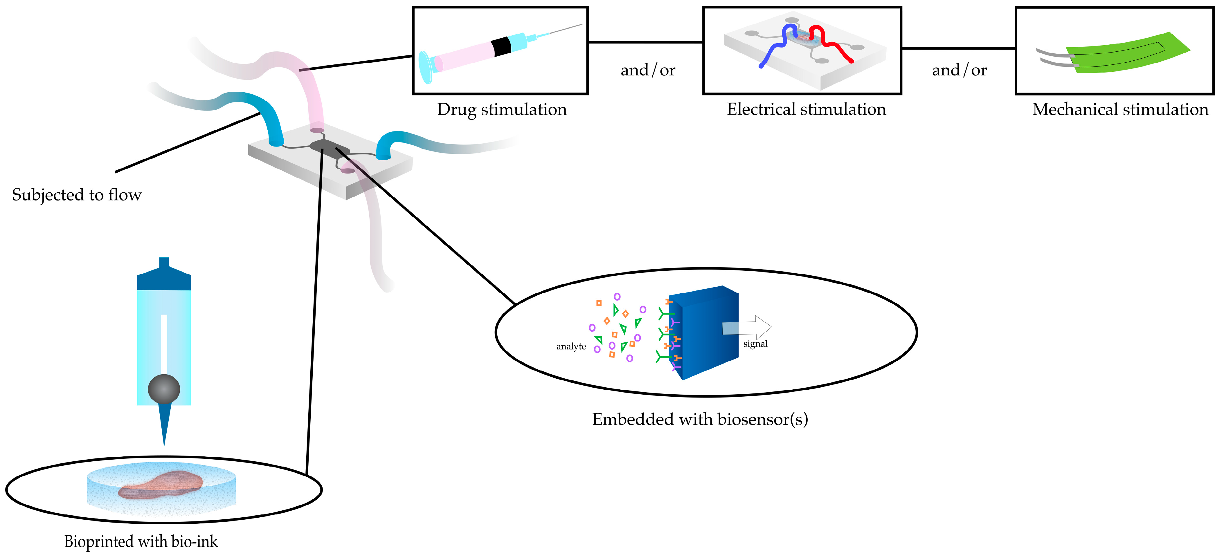 Although research on the integration of microfluidic technology with 3D bioprinting is limited, the subject presents significant opportunities for experimentation given the evident high-throughput benefits of both methodologies. The fabrication of HoC predominantly utilizes 3D printing technology for one or both of two principal functions: the production of the main body of the chip [13] and the generation of the cardiac tissues [83]. Among the studies employing the combined technique of bioprinting and HoC technology, Faulkner-Jones and colleagues [121] built and validated a valve-based cell-printing system, demonstrating that there was no significant impairment of the physiological function of the human induced pluripotent stem cell (hiPSC)-derived CMs compared to the standard manual pipetting cell-culture methods. An emerging approach to streamline the generation and further characterization of the behaviour of EHTs is to combine the advantages of bioprinting cardiac constructs with those of microfluidic devices (Figure 2). For example, subjecting the bioprinted tissue with different flow rates stimulates in vivo conditions for cell maturation. Further stimulation using electrical signals, mechanical force, or even injection of different drugs will alter the state of the tissue to reflect pathological or normal state of the heart.