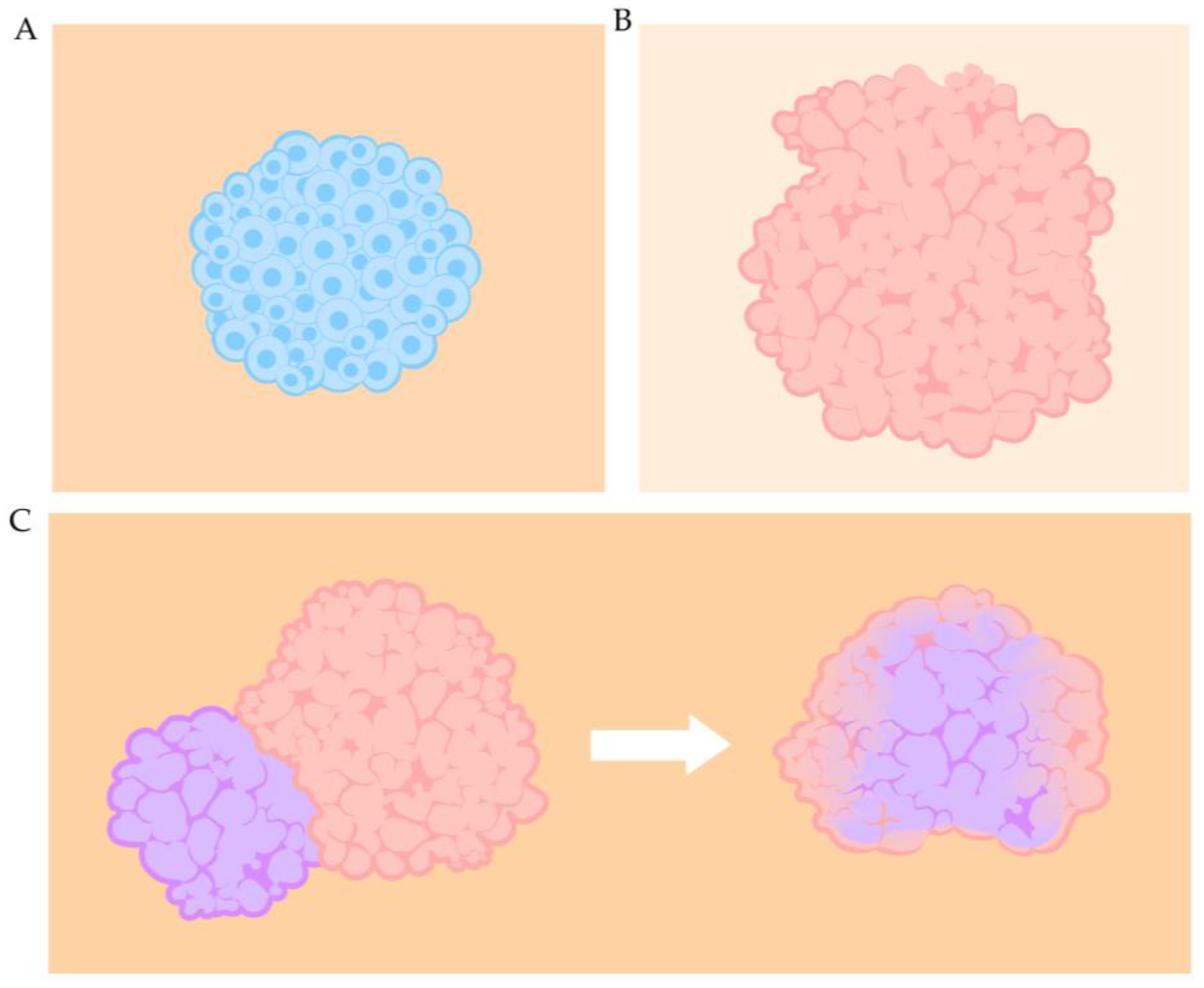 Figure 3. A diagram of the main types of OBBs. (A) A cardiac spheroid, (B) a cardiac organoid, and (C) the fusion of two types of organoids (cardiac and brain) into one type of assembloid.