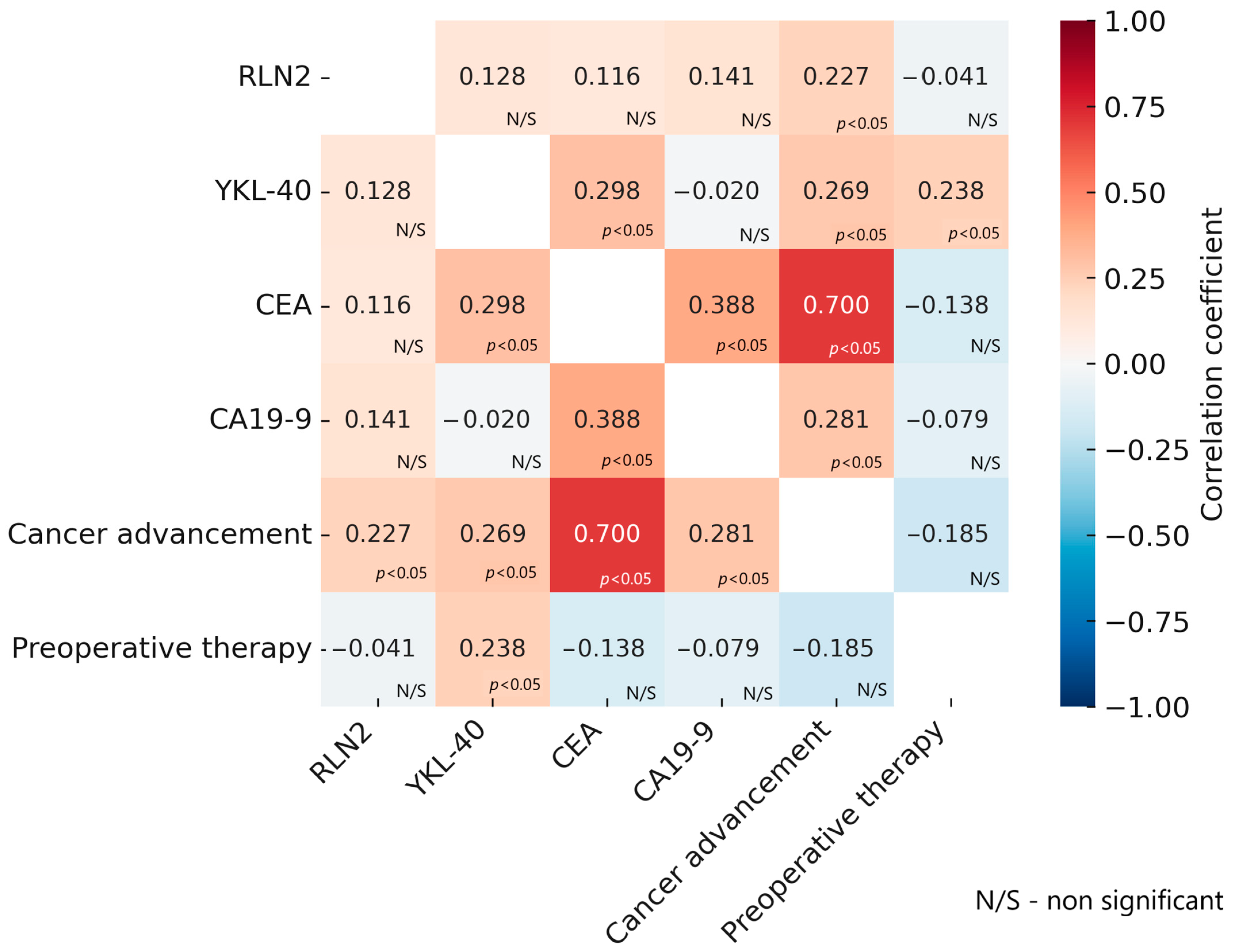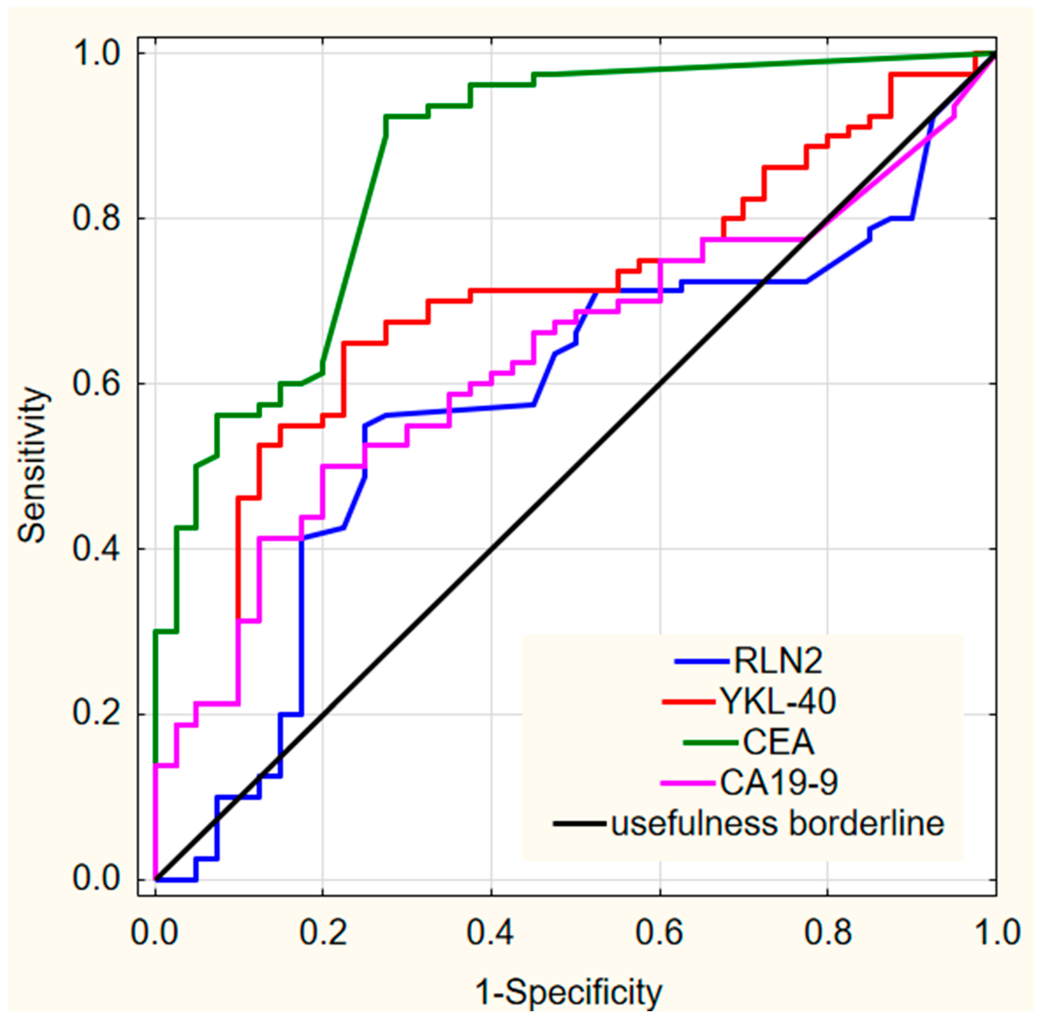 | Parameter | RLN2 | YKL-40 | CEA | CA 19-9 | |