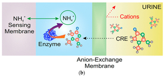 (a) Schematic representation of the uric acid sensing setup using ZnO-NFs coated with immobilized uricase form the working electrode, where enzymatic oxidation of uric acid generates ionic products detectable as a potential shift [48]; (b) Architecture of a thin-layer enzymatic potentiometric biosensor for creatinine in undiluted urine: creatinine (CRE) diffuses through an anion-exchange membrane, is converted by creatinine deiminase to ammonium ions, and is subsequently quantified by an NH4+-selective membrane electrode [50].