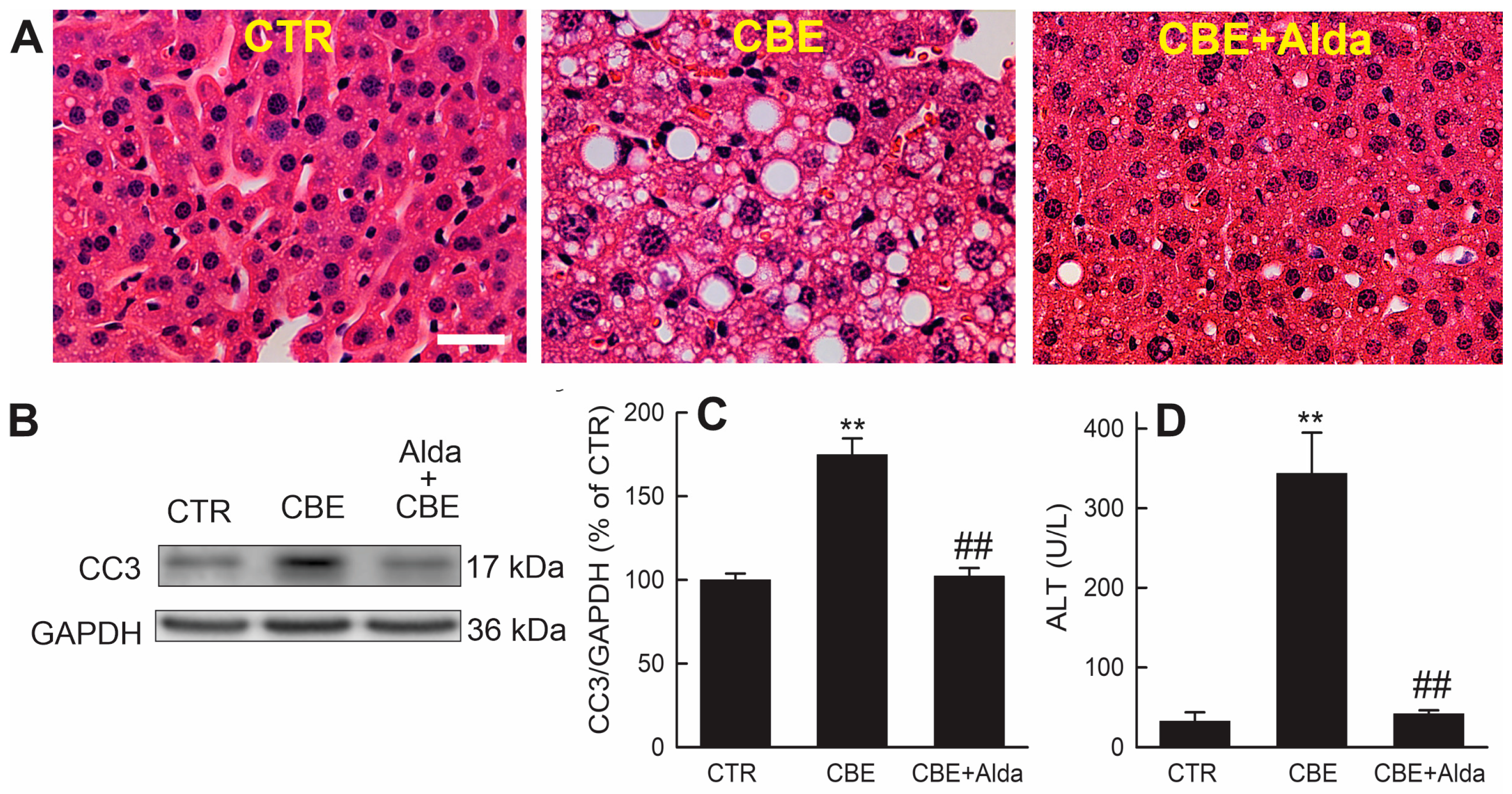 2.2. Chronic Binge Ethanol Causes Hepatic Steatosis, Injury, Inflammation, and Stellate Cell Activation: Attenuation by Alda-1