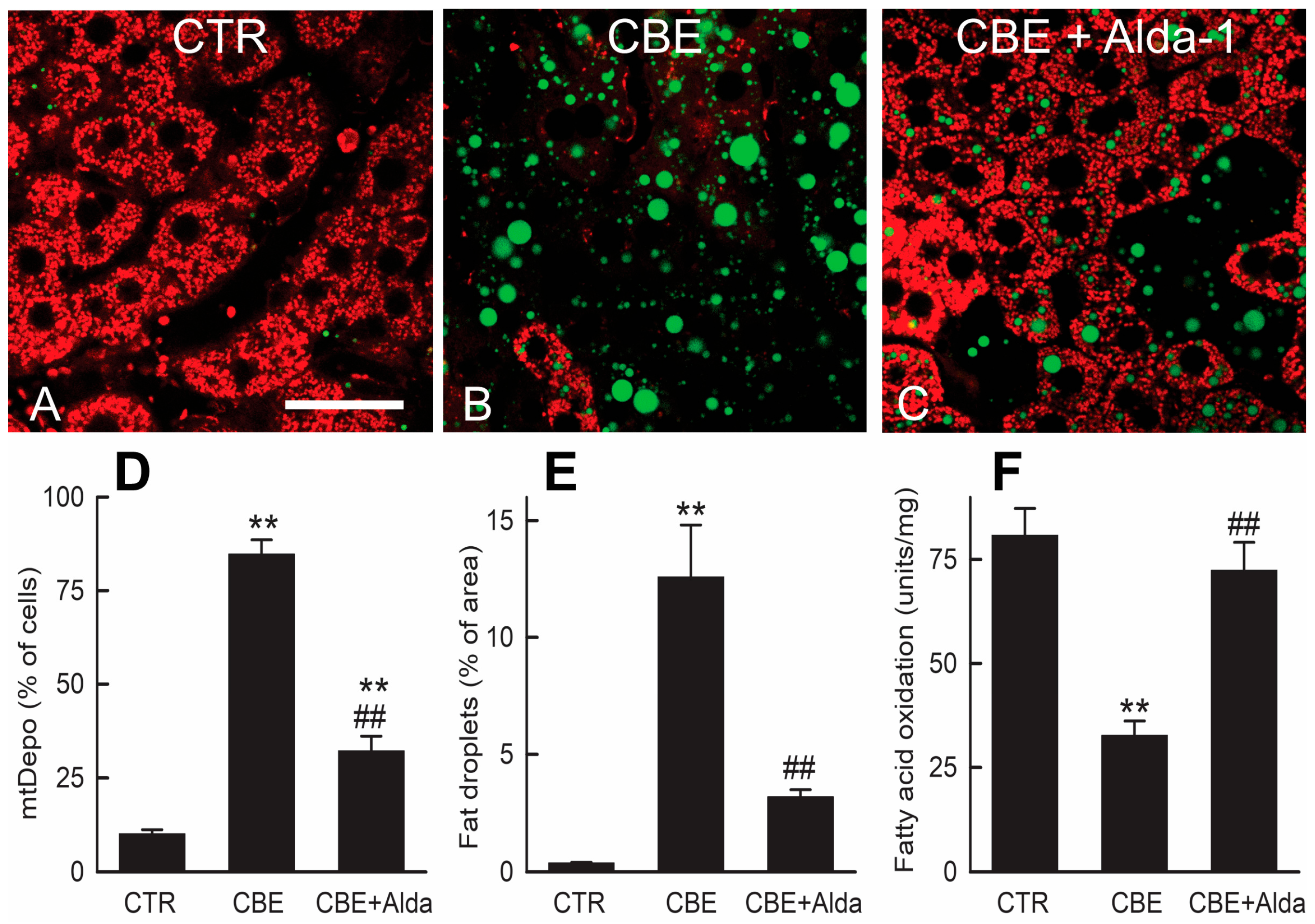 2.3. Chronic Binge Ethanol Causes Mitochondrial Depolarization and Fat Droplet Accumulation and Suppresses Fatty Acid Oxidation in the Liver: Blunting by Alda-1