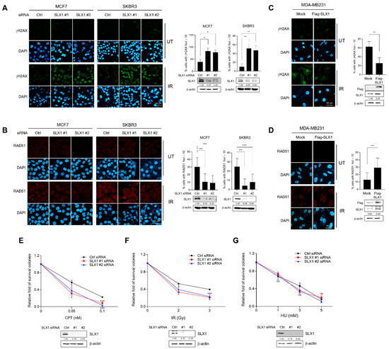 SLX1 contributes to double-strand break (DSB) repair in human breast cancer cells. (A,B) MCF7 and SK-BR3 cells with or without an SLX1 knockdown are irradiated with 10 Gy of ionizing radiation (IR) and fixed at various time points. Cells are immunostained with antibodies against γH2AX (A) or RAD51 (B), respectively, and DNA is counterstained with DAPI. Scale bar = 50 μm. Percentage of cells harboring more than ten γH2AX or RAD51 foci is shown. Data represent mean ± SEM. * p < 0.05, ** p < 0.01. (C,D) MDA-MB231 cells are transfected with either Flag-mock or Flag-SLX1. After irradiation of 10 Gy of IR, cells are fixed at the indicated time points. Immunofluorescence staining of cells is done with γH2AX (C) or RAD51 (D) antibodies, respectively. DNA is counterstained with DAPI. Histograms (right panels) represent the percentage of cells harboring more than ten γH2AX or RAD51 foci. Scale bars = 50 μm. Data are presented as mean ± SEM. ** p < 0.01, two-tailed Student’s t-test. (E–G) MCF7 cells are transfected with a control siRNA or two SLX1-targeting siRNAs. After 24 h, cells are replated and exposed for 14 days with camptothecin (CPT) (E), ionizing radiation (F), or hydroxyurea (HU) (G) at the indicated concentrations. Cell survival data are presented as mean ± SEM (n = 3). * p < 0.05, *** p < 0.001, ns, not significant. SLX1 knockdown in all data is confirmed by Western blot. All experiments is independently repeated three times.