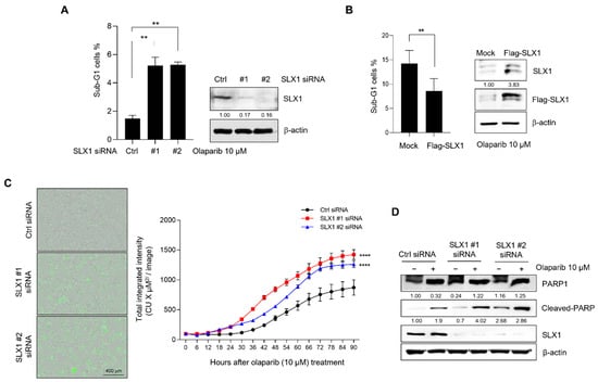 To assess if the increased Olaparib sensitivity in SLX1-depleted cells results from increased apoptosis, we first quantified the apoptotic sub-G1 population using flow cytometry. Following Olaparib exposure, we observed a significantly greater percentage of sub-G1 cells in SLX1-depleted populations compared to controls (Figure 5A). The sub-G1 fraction increased nearly threefold, indicating that SLX1 ablation enhances Olaparib-induced apoptosis. As expected, SLX1 overexpression in MCF7 cells produced the opposite effect, leading to an approximately 40% reduction in the sub-G1 populations after Olaparib treatment (Figure 5B).To further characterize the apoptosis dynamics, we performed live-cell imaging with Annexin V staining to detect the externalization of phosphatidylserine, an early apoptotic marker. The Annexin V signal appeared more rapidly and reached a greater intensity in SLX1-knockdown cells compared to controls following Olaparib exposure (Figure 5C). We confirmed these findings at the molecular level by assessing the cleavage of PARP1, a hallmark of apoptosis. While cleaved PARP1 was detected in both control and SLX1-depleted cells at 48 h post-treatment, its levels were notably higher in the SLX1-depleted cells (Figure 5D). Taken together, these findings suggest that SLX1 depletion enhances the therapeutic efficacy of Olaparib in breast cancer by promoting apoptosis.