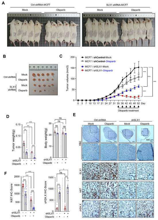 To validate our in vitro findings, we investigated whether SLX1 depletion enhances Olaparib efficacy in vivo. We established xenograft tumors in SCID mice using either control or SLX1-knockdown MCF-7 cells. Once the tumors reached a measurable size, mice were randomly assigned to four groups: control + vehicle, control + Olaparib, SLX1-knockdown + vehicle, and SLX-knockdown + Olaparib. Treatments were administered every 3–4 days for 52 days. This experimental design enabled the evaluation of SLX1 depletion and Olaparib treatment, both individually and in combination, on tumor growth (Figure 6A–C). Tumors in the control + vehicle group grew unabated throughout the study. Olaparib monotherapy had only modest tumor-suppressive effects, while SLX1-depletion alone also resulted in diminished growth compared to control tumors. Most strikingly, the combination of SLX1 depletion and Olaparib therapy profoundly suppressed tumor development, resulting in significantly smaller tumors than in all other groups. Quantitative analysis of tumor weights at the study’s endpoint confirmed these observations (Figure 6D). To understand the underlying mechanisms, we performed immunohistochemical analysis on the tumor tissues. Staining for Ki67, a proliferation marker, revealed that the combination therapy significantly reduced Ki67 levels compared to all other groups (Figure 6E,F). Concurrently, tumors from the combination therapy group showed significantly higher levels of γH2AX staining (Figure 6E,F), indicating persistent DNA damage. These in vivo findings corroborate our in vitro findings and demonstrate that SLX1 depletion enhances the antitumor efficacy of Olaparib in breast cancer.