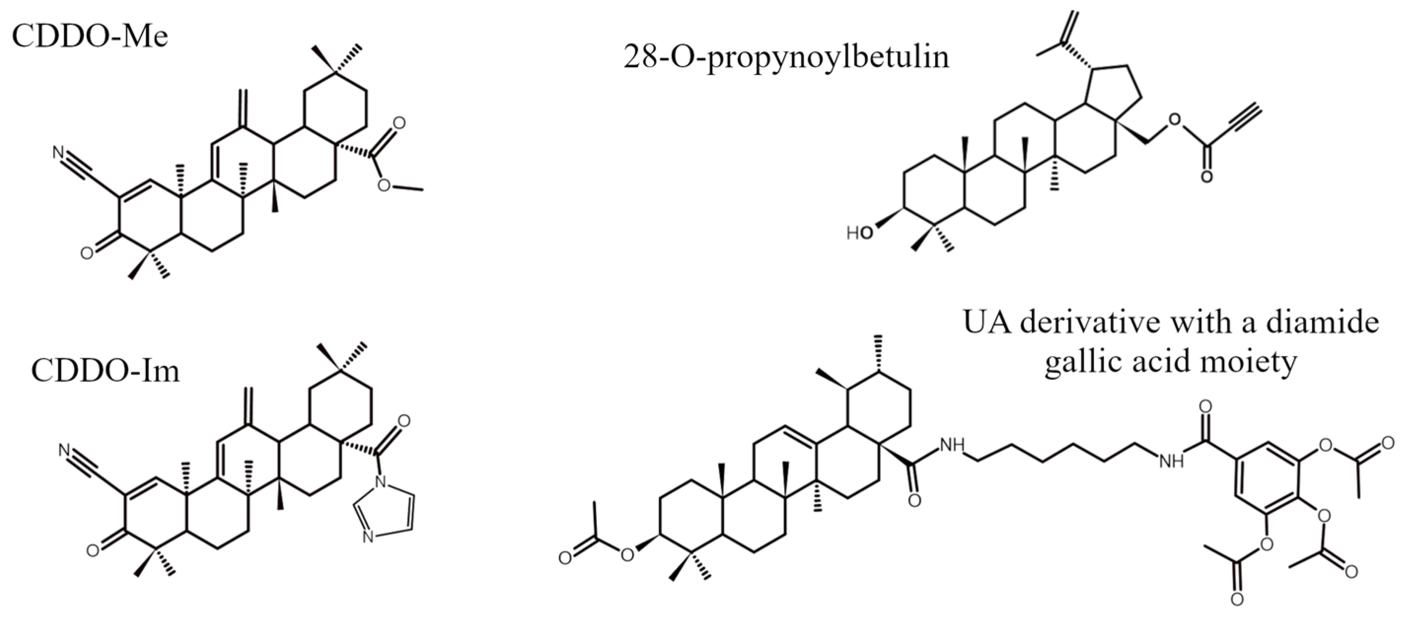 | Ursolic acid-derivatives with a diamide gallic acid moiety | ↓: NF-κB | ↑: apoptosis; ↓: cell proliferation, migration | SK-OV-3, A549, HepG2, T24 | [101] | |