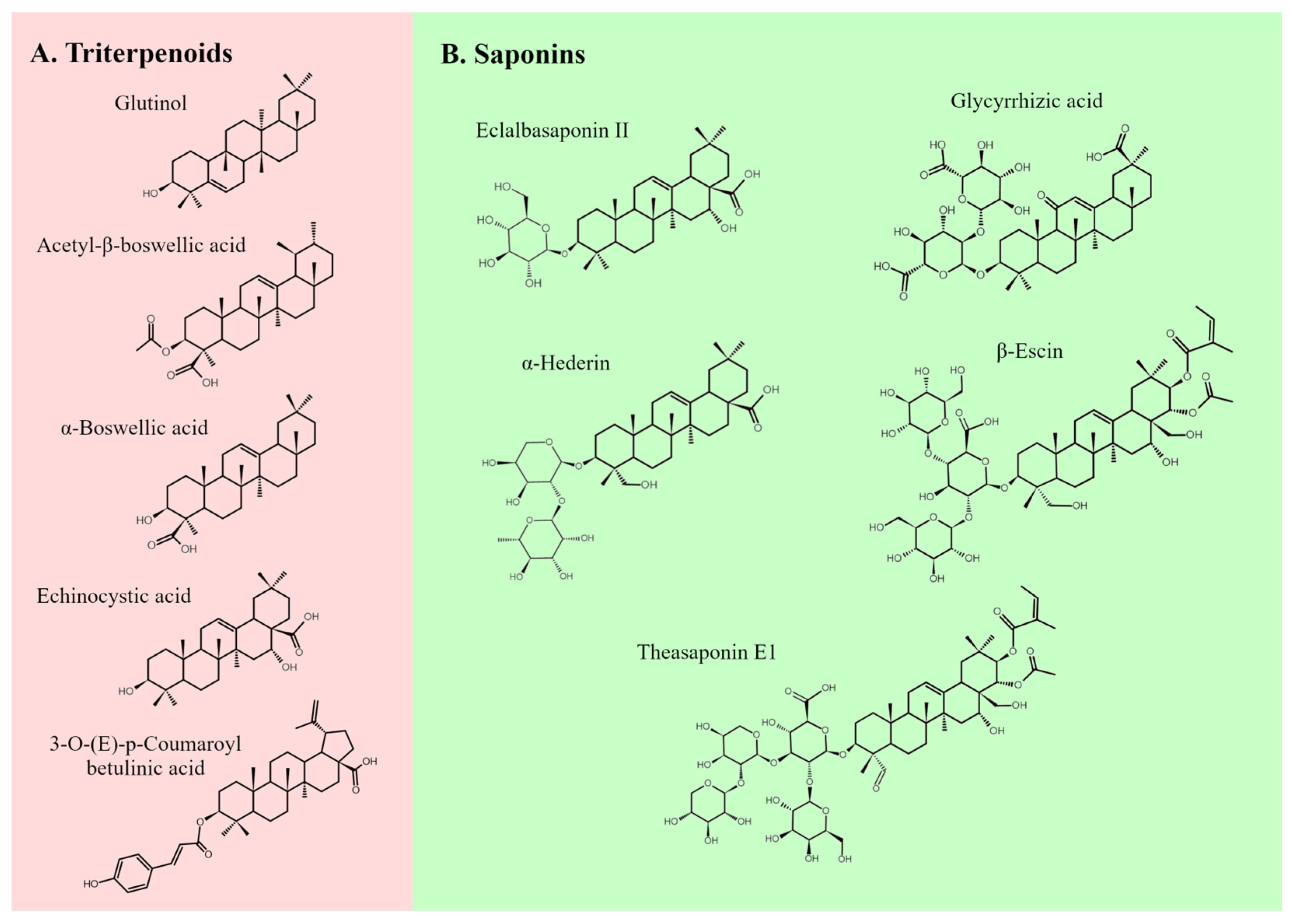 - Teng, W.; Zhou, Z.; Cao, J.; Guo, Q. Recent Advances of Natural Pentacyclic Triterpenoids as Bioactive Delivery System for Synergetic Biological Applications. Foods 2024, 13, 2226. [Google Scholar] [CrossRef]