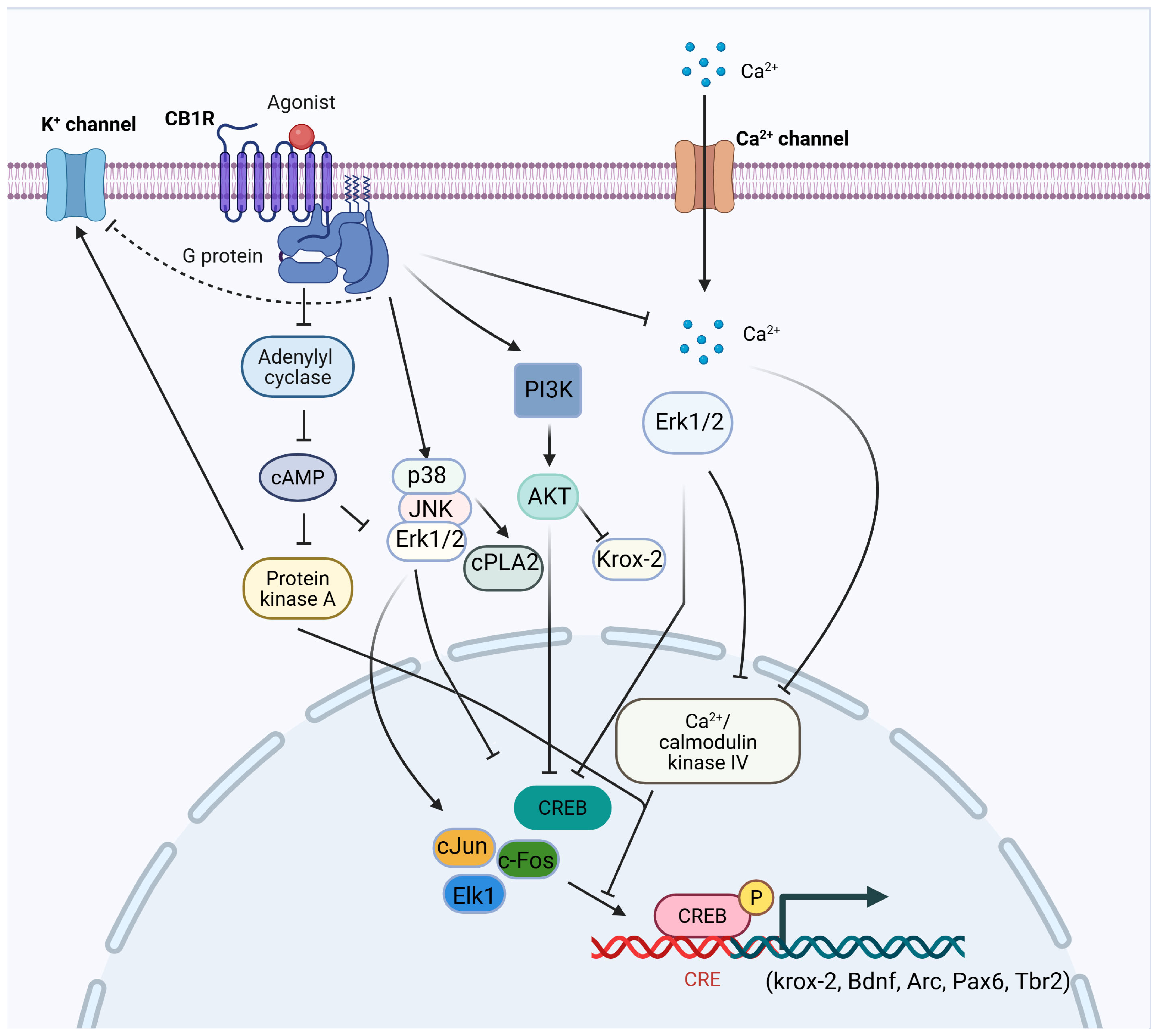 Figure 1. Schematic representation of CB1R signaling pathways. Both endogenous and mock cannabinoids exert their effects primarily through activation of CB1R [15,16,17,18]. CB1Rs are seven-transmembrane GPCRs embedded in the neuronal cell membrane [19]. Upon activation, CB1Rs inhibit AC activity [20,21,22], suppress N-type and P/Q-type voltage-gated calcium channels [23,24,25,26], and modulate potassium channels by inhibiting D-type and activating A-type as well as GIRKs [23,24,25,26,27]. CB1R signaling reduces presynaptic calcium influx through these mechanisms, thereby regulating neurotransmitter release and inhibiting synaptic transmission [28,29]. The Gα subunit primarily mediates the inhibitory actions on AC and calcium channels. At the same time, the Gβγ complex activates GIRKs and PI3K. Subsequent activation of the p38, JNK, and ERK1/2 pathways leads to phosphorylation of downstream effectors such as cPLA2, ELK-1, c-Fos, c-Jun, and CREB, promoting the transcription of target genes including krox-24 and BDNF [16,30]. PI3K also mediates AKT-dependent inhibition of CREB activation [30]. Furthermore, CB1R-induced inhibition of AC decreases cAMP levels, thereby reducing protein kinase A (PKA) activity and the phosphorylation of specific K+ channels [18,31,32]. Under certain physiological conditions, CB1R signaling can also suppress ERK1/2 activation, leading to reduced CaMKIV and CREB phosphorylation, and consequent inhibition of Arc gene expression [33,34]. Stimulatory effects are indicated by arrows (→) and inhibitory effects by blunt-ended lines (⊥). CB1R, cannabinoid receptor 1; GPCRs, G protein-coupled receptors; AC, adenylate cyclase; GIRKs, G protein-coupled inwardly rectifying potassium channels; PI3K, phosphoinositide 3-kinase; p38, p38 mitogen-activated protein kinase; JNK, Jun N-terminal kinase; ERK, extracellular signal-regulated kinases, cPLA2, cytosolic phospholipase A2; Elk-1, E26 transformation-specific domain containing protein 1; c-Fos, an inducible transcription factor that regulates the delayed onset of effector genes; c-Jun, stress-activated protein; CREB, cAMP-response element binding protein; AKT, protein kinase B; cAMP, cyclic adenosine monophosphate; CaMKIV, calcium/calmodulin-dependent protein kinase IV; PKA protein kinase A. (Figure was created with BioRender.com).