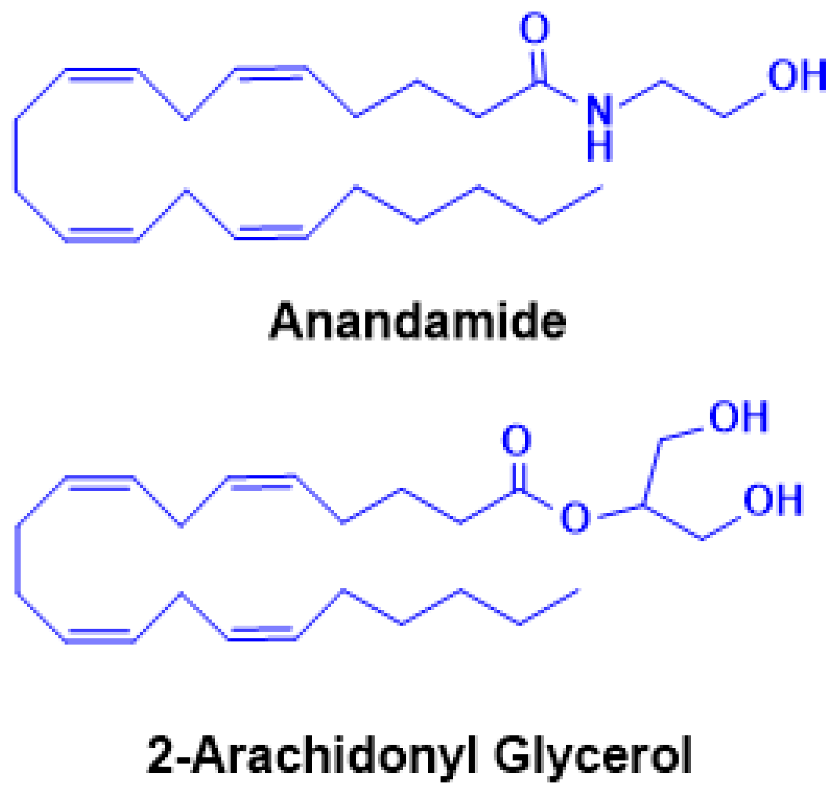 Figure 3. Chemical structures of endogenous cannabinoids anandamide (AEA) and 2-arachidonoylglycerol (2-AG). The two principal endocannabinoids, AEA and 2-AG, are lipid-derived signaling molecules synthesized on demand from membrane phospholipid precursors. Both AEA and 2-AG act as endogenous ligands for cannabinoid receptors CB1R and CB2R, mediating a wide range of physiological and neurobiological processes.