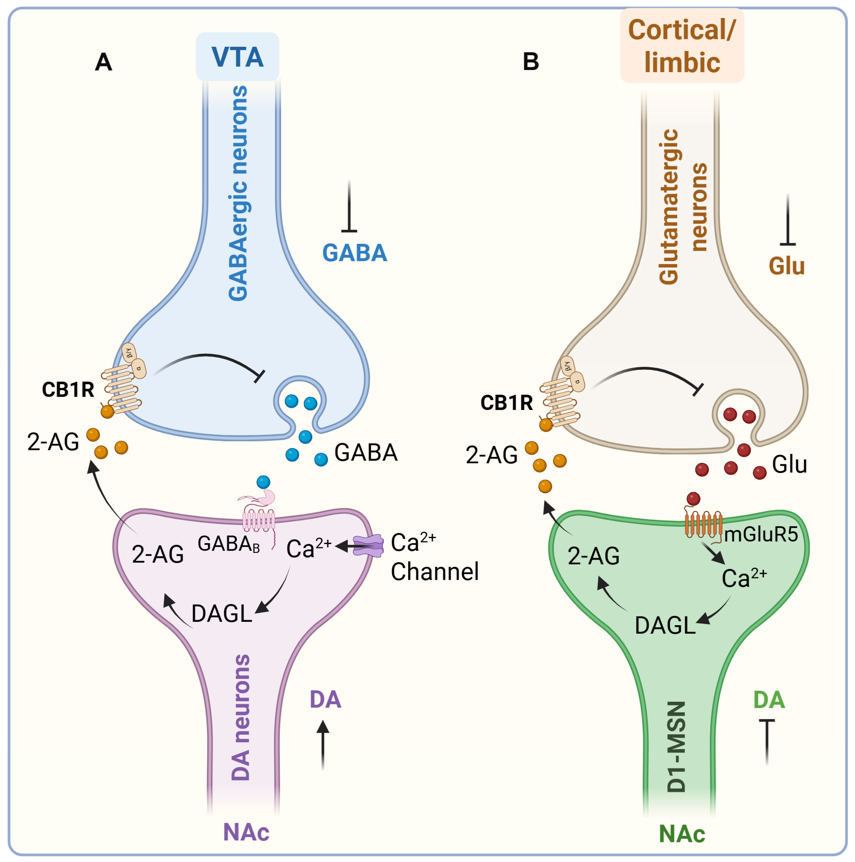 In addition to regulating DA neuron activity within the VTA, eCBs also act at VTA projection sites in the NAc. Within the NAc, eCBs interact with medium spiny neurons (MSNs) and prefrontal cortical glutamatergic inputs, particularly at prelimbic cortex–NAc synapses [136]. eCB signaling plays a multifaceted role in shaping dopamine transmission and reward-related activity, not by directly inhibiting DA release at D1-MSNs, but by modulating the glutamatergic and GABAergic afferents that regulate MSN excitability. Glutamatergic projections from the prefrontal cortex activate postsynaptic mGluR5 receptors, stimulating diacylglycerol lipase (DAGL) to produce 2-AG. The resulting 2-AG acts retrogradely on presynaptic CB1 receptors to reduce glutamate release, fine-tune excitatory drive onto D1-MSNs, and modulate excitatory transmission [137]. Disruption of this mGluR5–2-AG–CB1R pathway eliminates both natural and drug reward-seeking behaviors [138,139], and activation of these prefrontal inputs can induce 2-AG-dependent long-term depression (LTD) at NAc glutamatergic synapses [137,140,141]. Genetic studies further support this mechanism: conditional deletion of mGluR5 in D1- but not D2-MSNs abolishes 2-AG-dependent LTD and prevents reward-seeking behavior [142], whereas pharmacological enhancement of 2-AG in the NAc restores LTD and reward seeking [137].