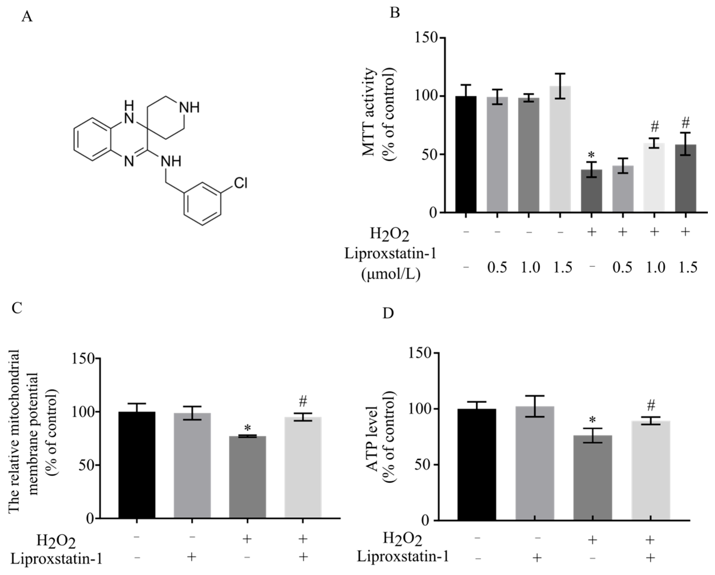 2.1. Liproxstatin-1 Preserves Cell Viability and Mitochondrial Function in H2O2-Exposed SH-SY5Y Cells