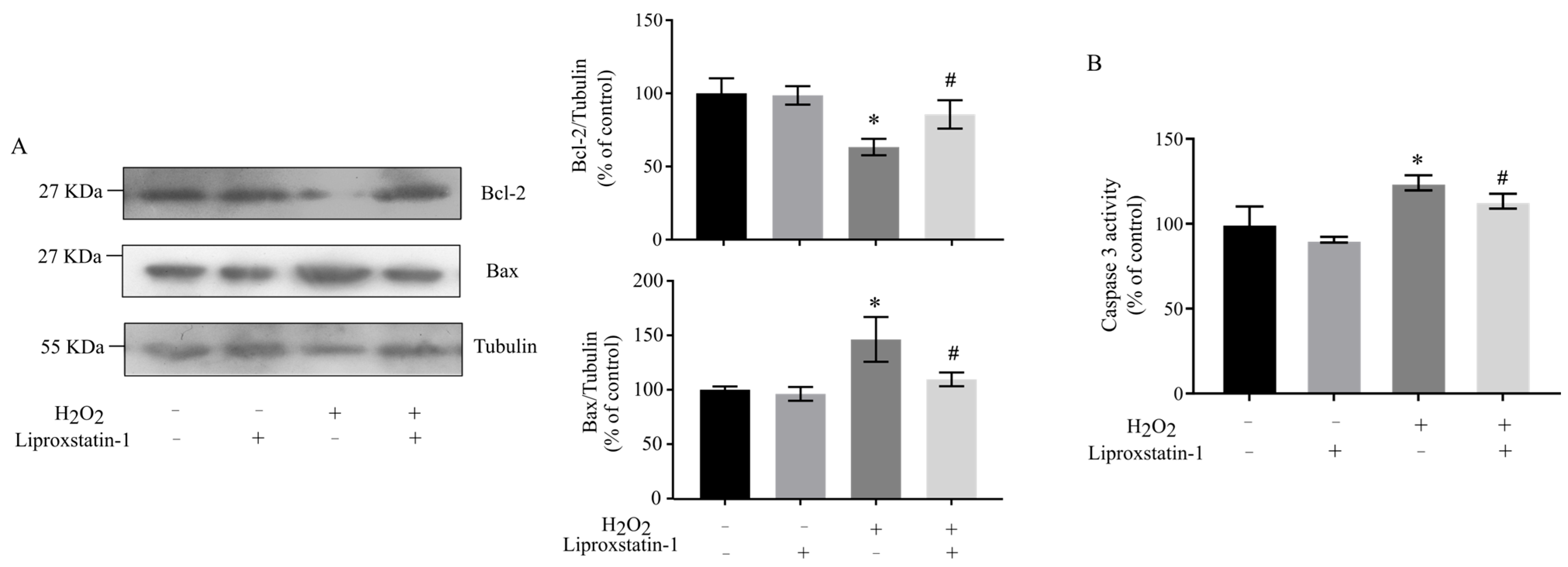 2.4. Liproxstatin-1 Attenuates H2O2-Induced Apoptosis in SH-SY5Y Cells via Regulation of Mitochondrial Pathways