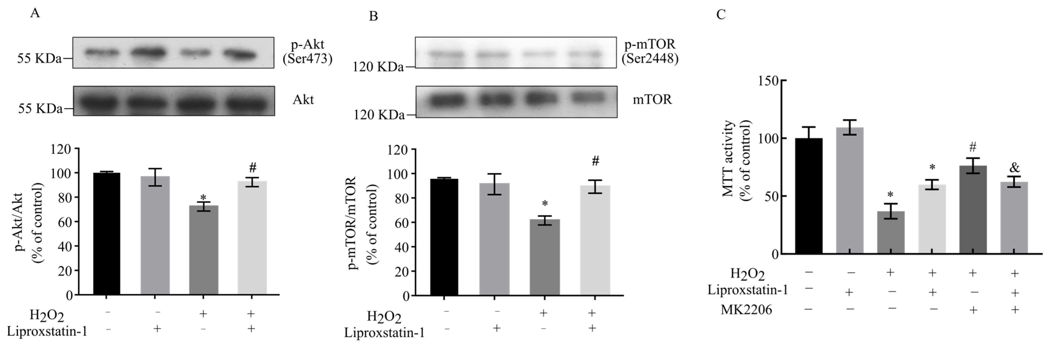 2.5. Liproxstatin-1 Preserves Akt/mTOR Signaling in H2O2-Exposed SH-SY5Y Cells
