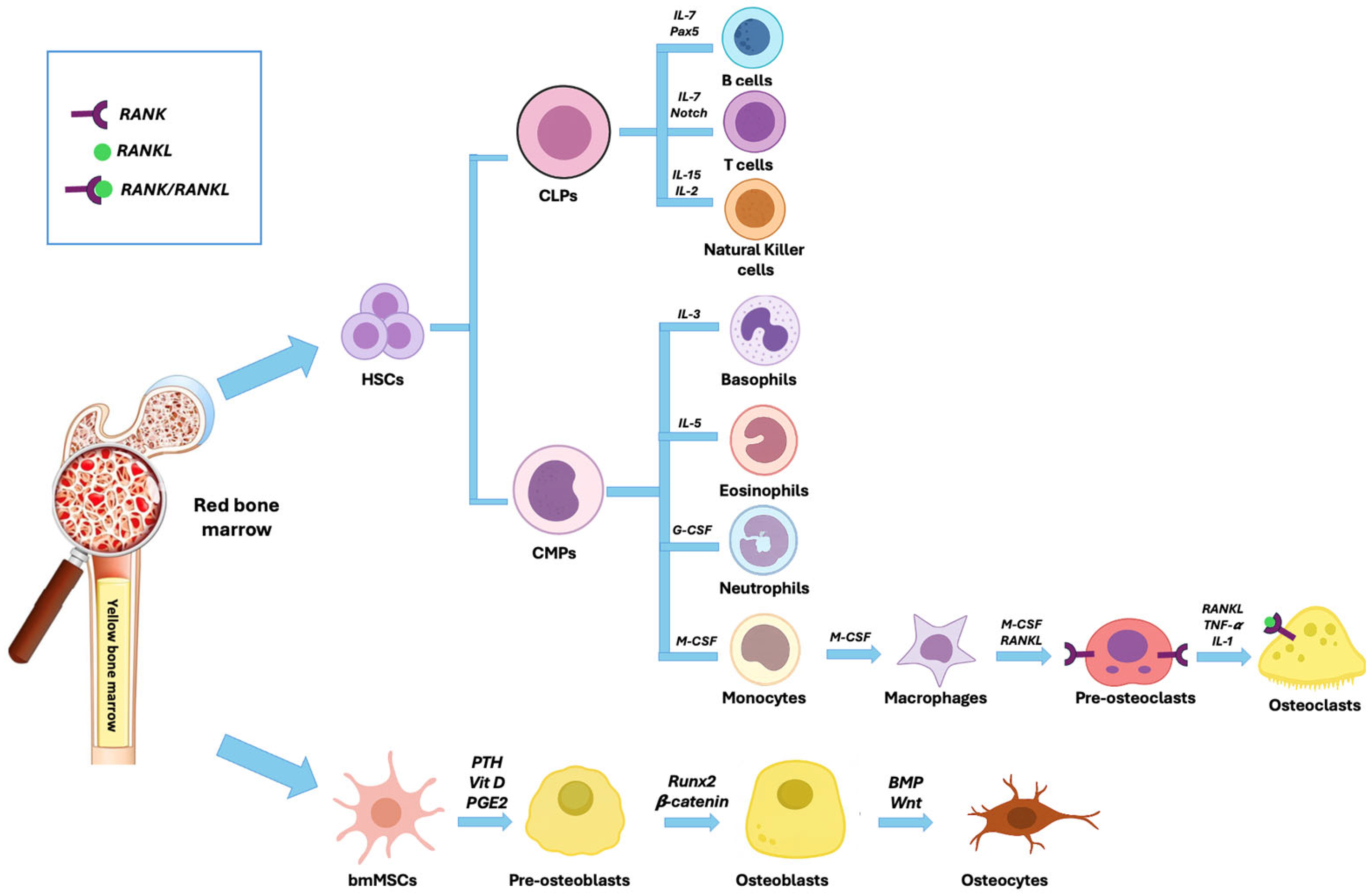 Bone and immune systems share developmental origins and signaling pathways [22]. Osteoclasts, the bone-resorbing cells, originate from myeloid precursors common to macrophages and dendritic cells, while osteoblasts, responsible for bone formation, regulate hematopoietic stem cell niches. Within the bone marrow microenvironment, bone, immune, and stromal cells communicate through cytokines, chemokines, and growth factors that modulate remodeling [23].