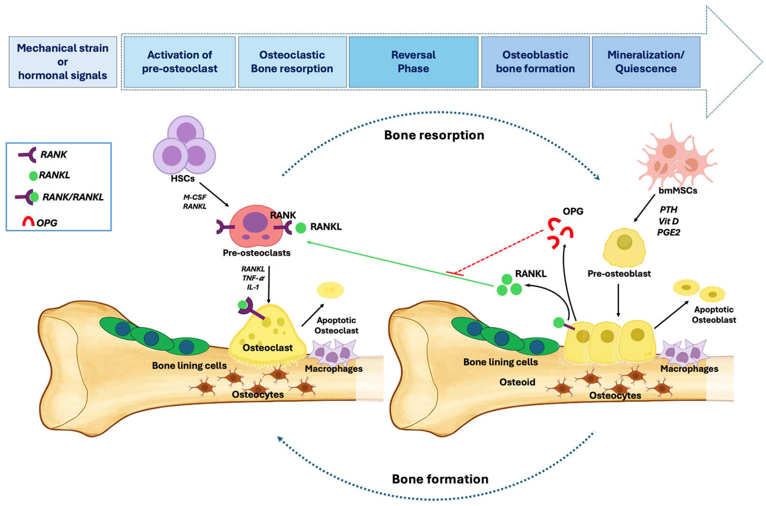 The cycle begins with activation, triggered by mechanical strain or hormonal signals such as estrogen or parathyroid hormone, which are detected by osteocytes [35,36] (Figure 2). This initiates resorption, driven by osteoclast precursors. Following osteoclast apoptosis, the reversal phase begins, with osteoblasts synthesizing new matrix to fill the cavities left by resorption. The final mineralization phase calcifies the matrix, after which osteoblasts undergo apoptosis, become bone-lining cells, or are incorporated into the matrix as osteocytes, entering quiescence [37,38].
