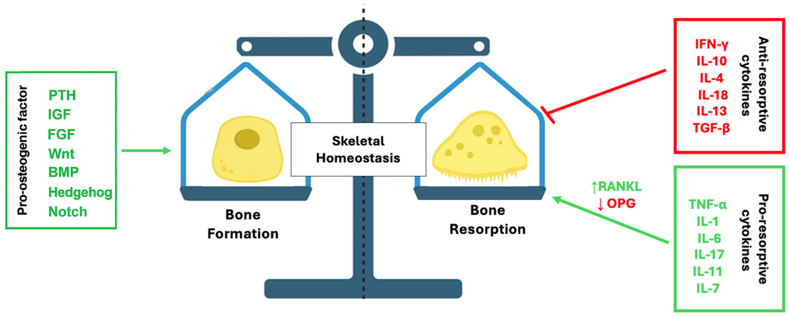 The bone microenvironment is a dynamic niche where immune cells and bone cells communicate through cytokines, chemokines, and growth factors. This crosstalk is central to maintaining skeletal integrity and responding to physiological and pathological stimuli.
