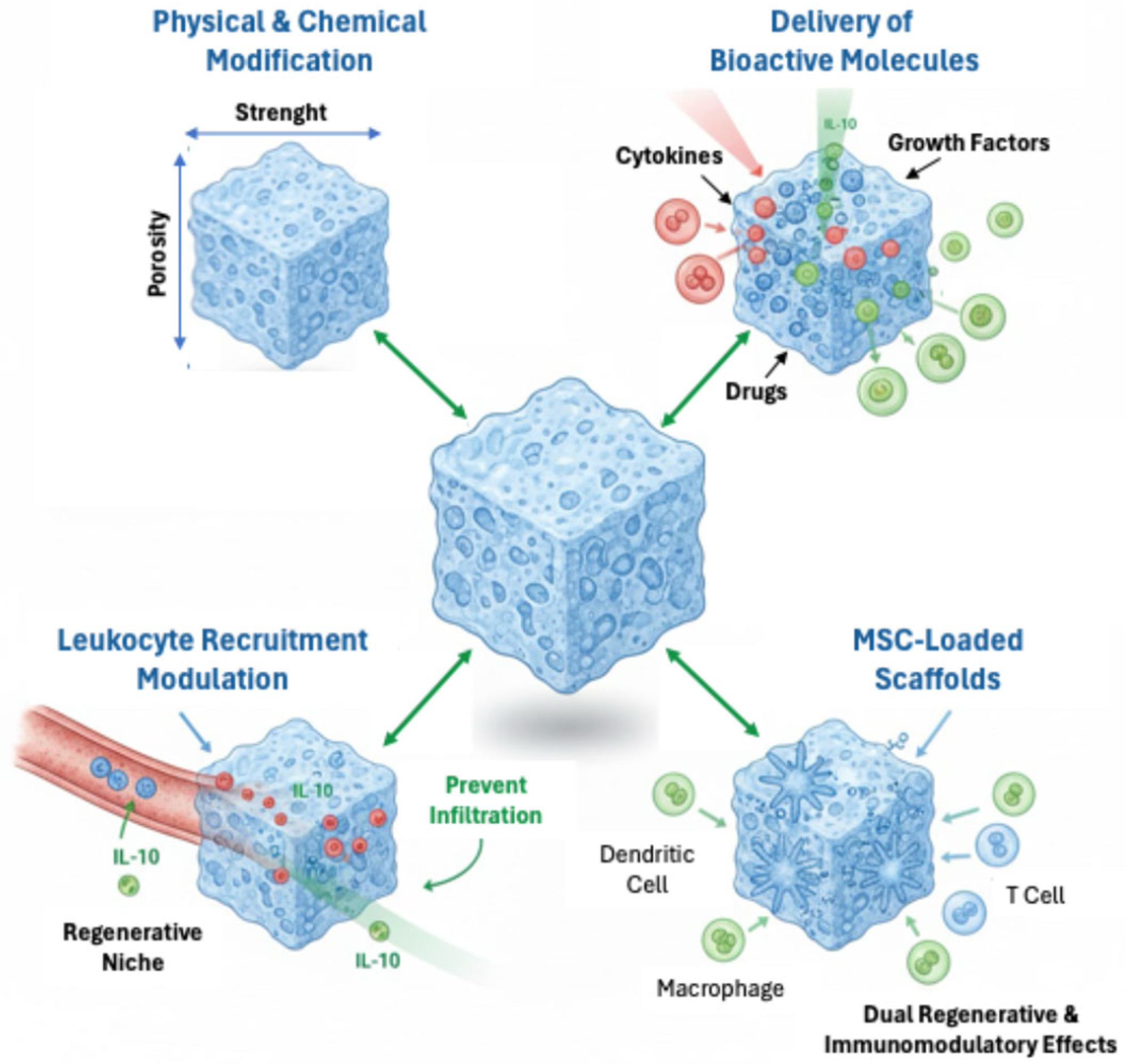 One primary approach involves the physical and chemical modification of scaffold properties. Parameters such as stiffness, geometry, hydrophilicity, surface charge, pore size, and porosity have been shown to significantly influence immune cell behavior and cytokine secretion, thereby shaping the inflammatory response and promoting tissue integration [109,113]. For example, surface topography and mechanical cues can guide macrophage polarization and dendritic cell activation, contributing to a pro-regenerative immune niche.