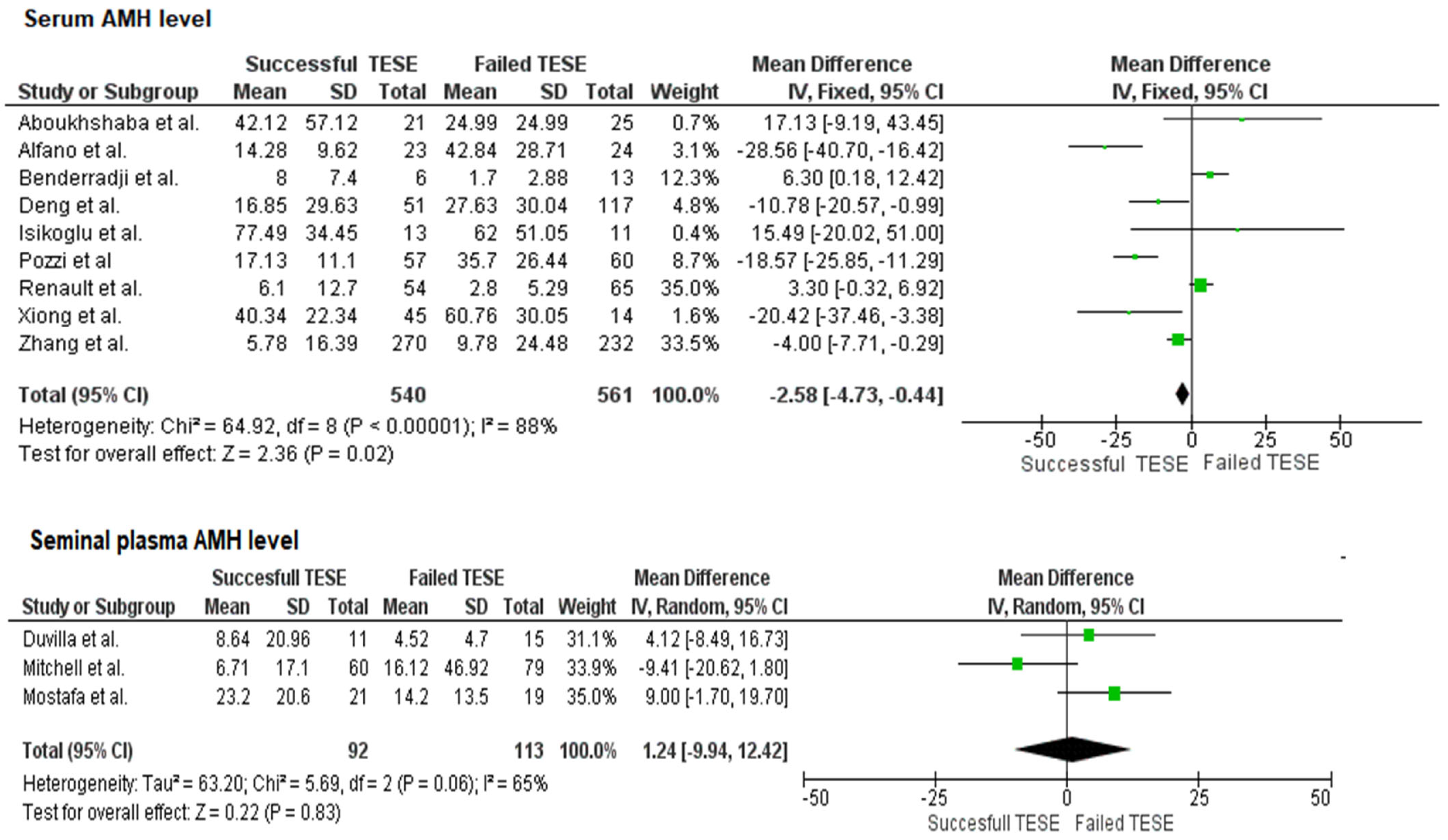- Xiao, H.; Ding, Y.L.; Yang, P.; Chen, Q.; Huang, H.L.; Chen, X.; Zhou, H.L.; Tang, S.X. Association between anti-Müllerian hormone concentrations and sperm retrieval outcomes in patients with idiopathic non-obstructive azoospermia: A systematic review and meta-analysis. Asian J. Androl. 2024, 26, 522–527. [Google Scholar] [CrossRef]