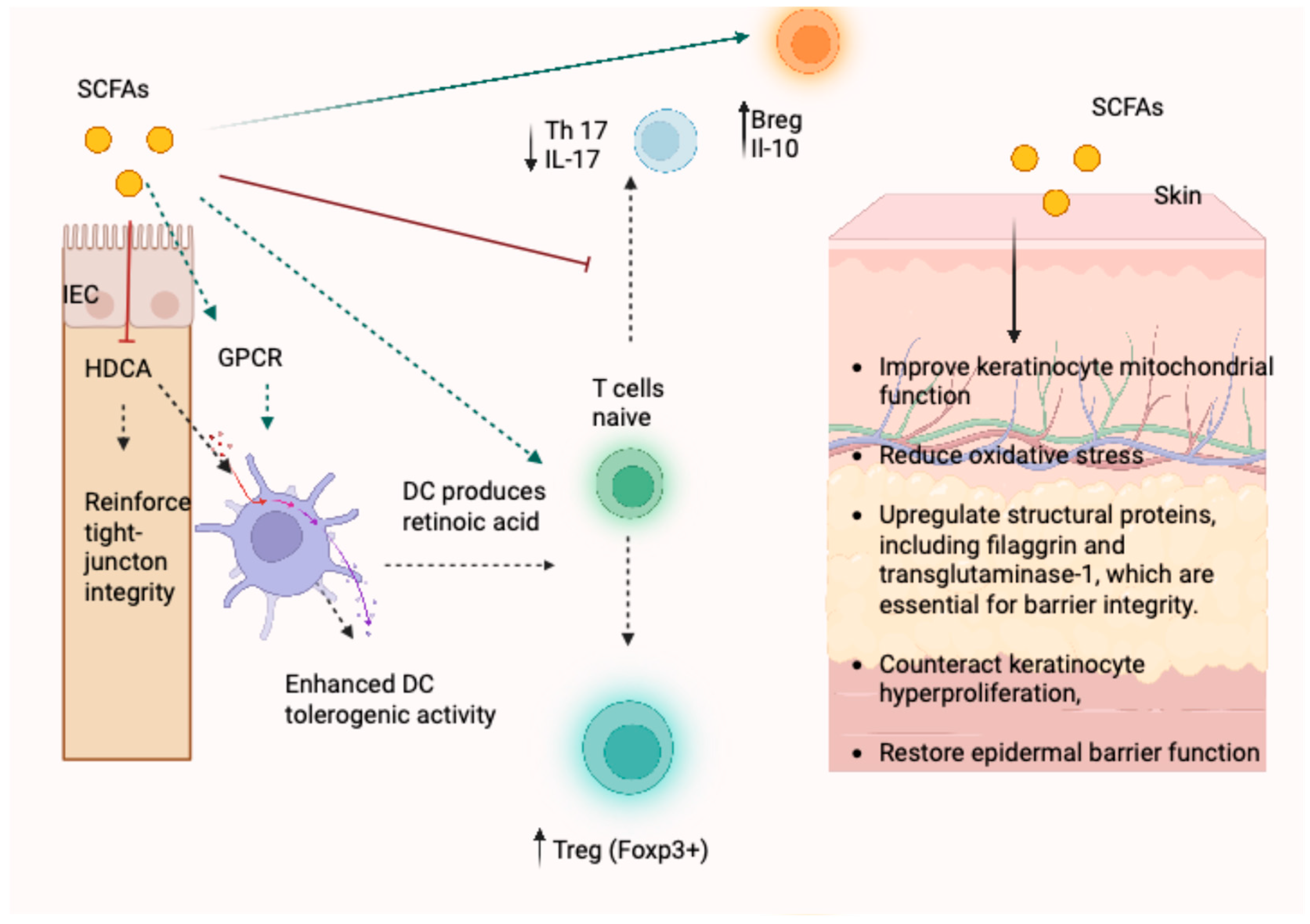 | GPCR activation | IECs, DCs, macrophages, T cells | ↑ IL-10, ↓ IL-17; regulation of neutrophil chemotaxis; promotion of Treg development | Reduced GPR43/109A expression in psoriatic skin; restored by butyrate |
