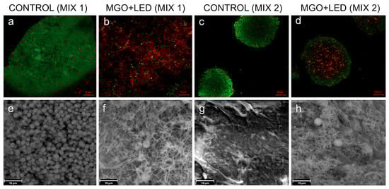 Figure 3. Representative CLSM and SEM images of LCWBs, comparing the effects of MGO + LED treatment on MIX 1 (S. aureus PECHA 10, P. aeruginosa PECHA 4, C. albicans X3) (b,f) and MIX 2 (S. aureus LMMV, P. aeruginosa LMMV, C. albicans X3) (d,h), in comparison to untreated controls (MIX 1: (a,e); MIX 2: (c,g)). CLSM observation (ad): Original magnification 1000× (scale bars = 10 μm). SEM observation (eh): Original magnification, 3600× (scale bars = 10 μm). Abbreviations: CLSM—Confocal Laser Scanning Microscopy; SEM—Scanning Electron Microscopy; LCWB—Lubbock Chronic Wound Biofilm; MGO—Methylglyoxal; LED—Light-Emitting Diode.