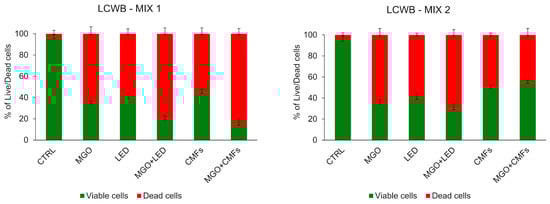 Figure 5. Percentages of viable/dead cells of the microbial population in LCWB–MIX 1 and LCWB–MIX 2 after the treatments, compared with the untreated control (CTRL). The samples were observed with CLSM using a Live/Dead staining BacLight viability kit. (Error bars = standard deviation). Abbreviations: LCWB—Lubbock Chronic Wound Biofilm; MGO—Methylglyoxal; LED—Light-Emitting Diode; CMFs—Complex Magnetic Fields; CLSM—Confocal Laser Scanning Microscopy.