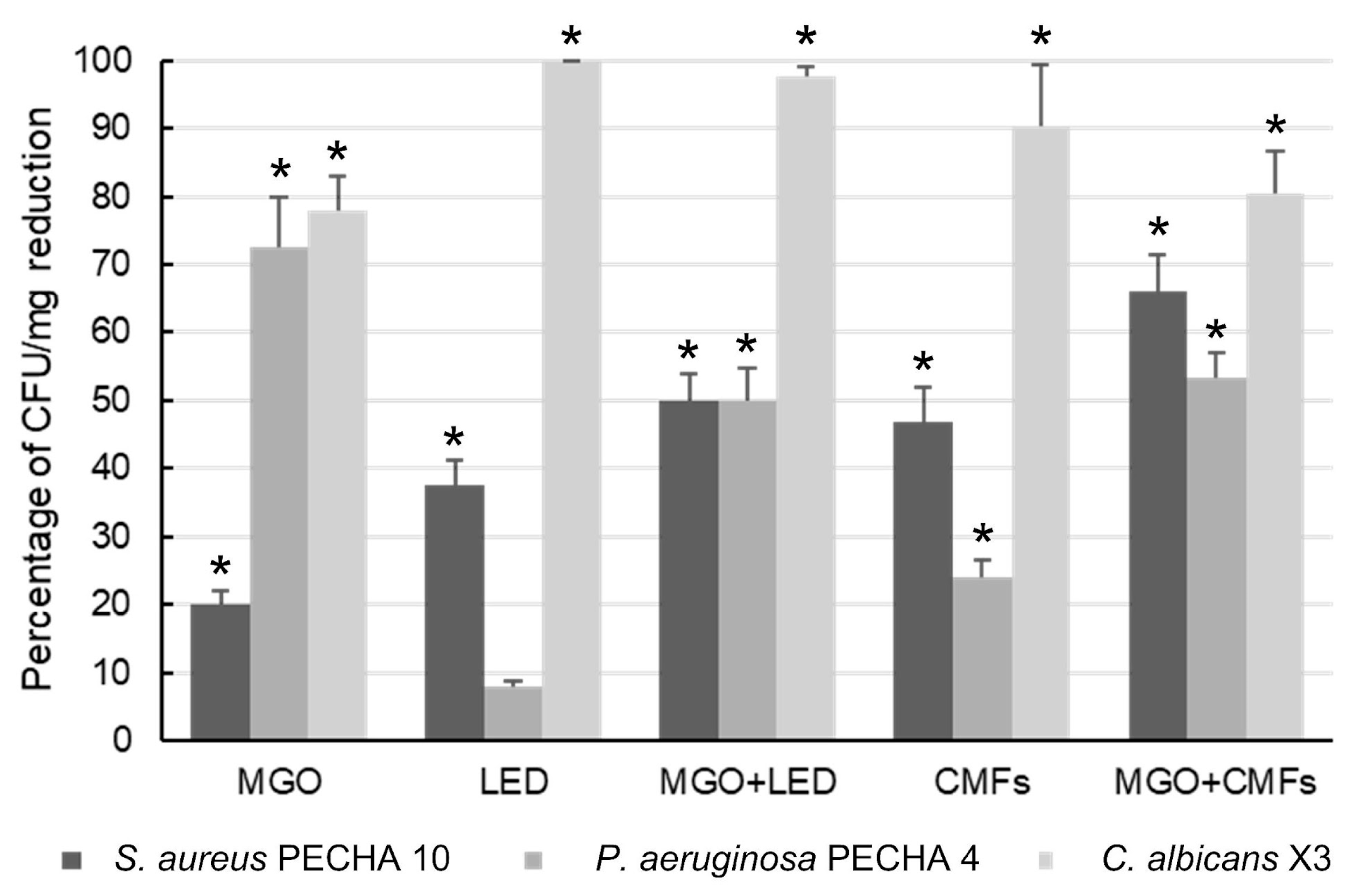 Figure 2. Percentages of CFU/mg reduction in S. aureus LMMV, P. aeruginosa LMMV and C. albicans X3 (MIX 2) in LCWBs in presence of MGO, LED, CMFs and their combinations. Results were evaluated 24 h after treatments. * Statistically significant (p  <  0.05) value compared to the untreated controls. Results are expressed as mean ± standard deviation (SD) of four independent experiments, all performed on separate days. Error bars = SD. Abbreviations: LCWB—Lubbock Chronic Wound Biofilm; MGO—Methylglyoxal; LED—Light-Emitting Diode; CMFs—Complex Magnetic Fields.