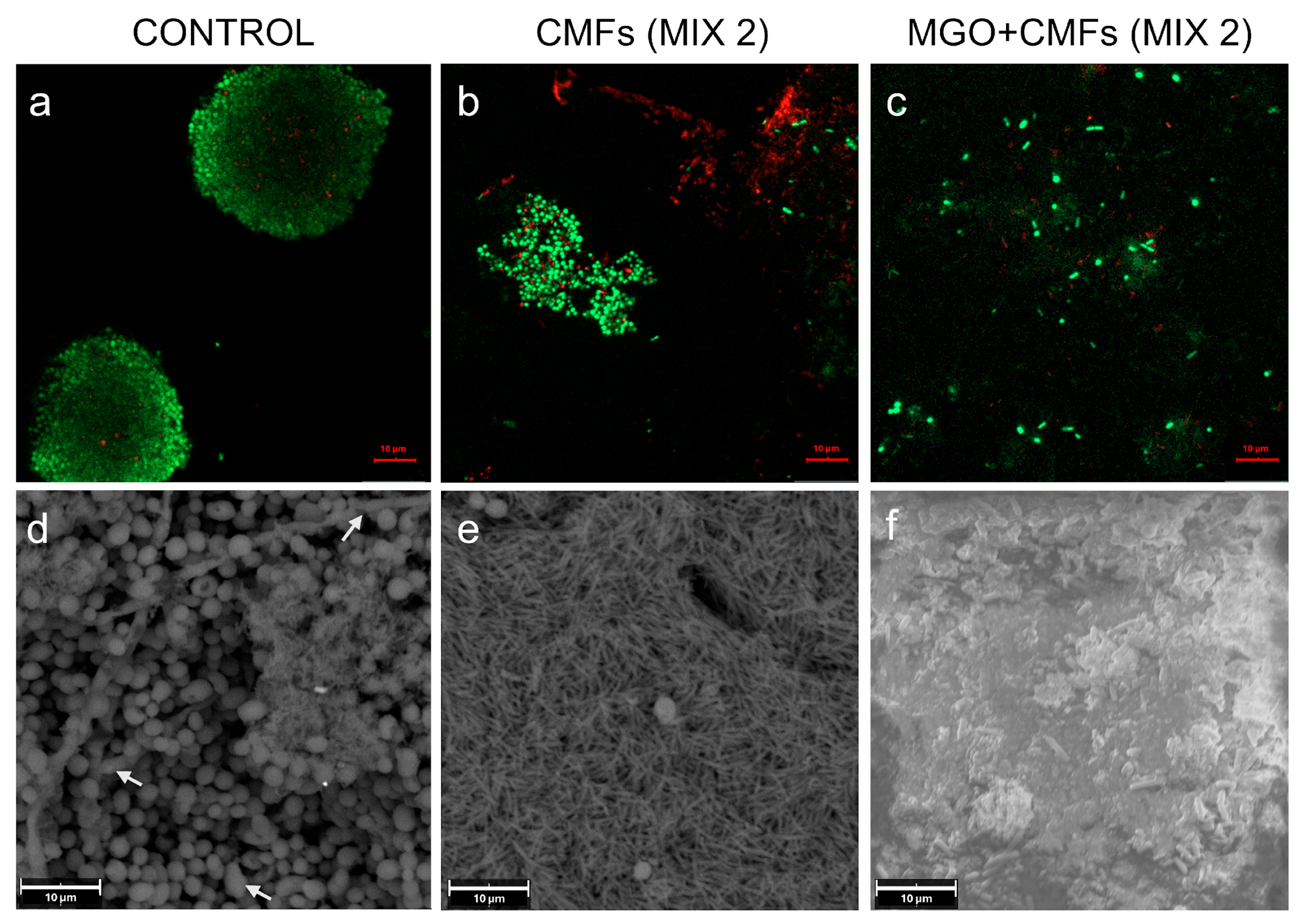 Figure 4 shows CLSM and SEM images of CMFs and MGO + CMFs, evaluated 24 h after treatment, against the microorganisms of MIX 2 in the LCWB model. In untreated samples, clusters of viable bacterial cells were detected by CLSM (Figure 4a). SEM analysis revealed the cluster organization of C. albicans cells with adherent P. aeruginosa and S. aureus (Figure 4d), as well as the presence of pseudohyphae, indicated by white arrows. Figure 4b,e shows the effect of CMFs against MIX 2, evaluated 24 h post-treatment, resulting in a microbial cluster disaggregation and a reduction in P. aeruginosa cell viability, confirmed by CLSM analysis. The MGO + CMFs (Figure 4c) combination enhanced cluster disaggregation and significantly reduced cell viability compared to CMFs alone (Figure 4b). SEM analysis showed the capability of CMFs to inhibit Candida yeast-to-hyphae transition (Figure 4e). Moreover, the analysis in Figure 4f shows that MGO + CMFs also exerted its antimicrobial effect through a wrapping mechanism, entrapping microbial cells and limiting their viability.