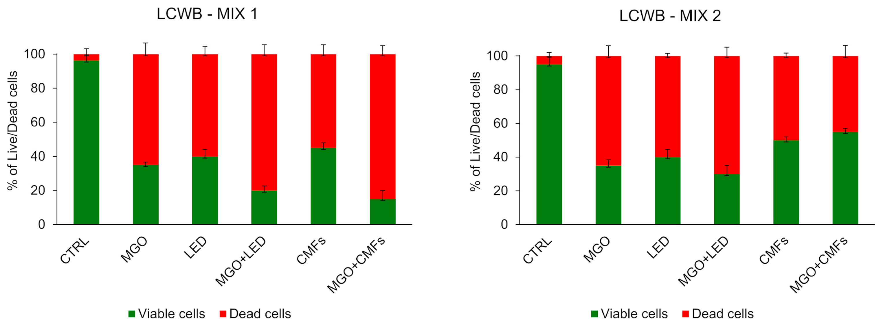 Figure 5 represents the viable/dead distribution of the microbial community in the LCWBs for all applied treatments. Variable reductions can be noticed in all conditions, with the majority of red cells coming from when LCWB-MIX 1 was treated with the combinations MGO + LED (80% of dead cells) or MGO + CMFs (85% of dead cells).