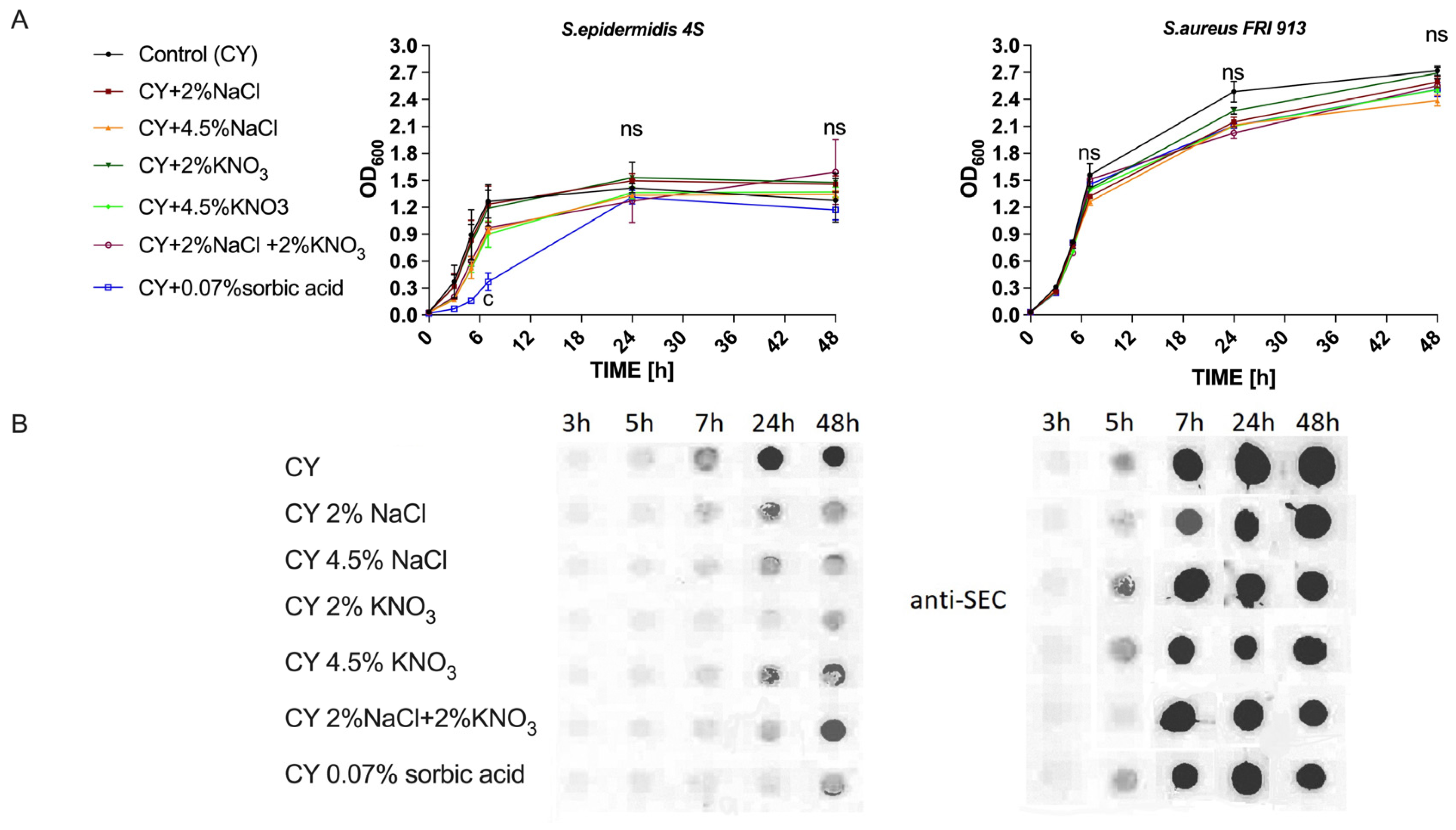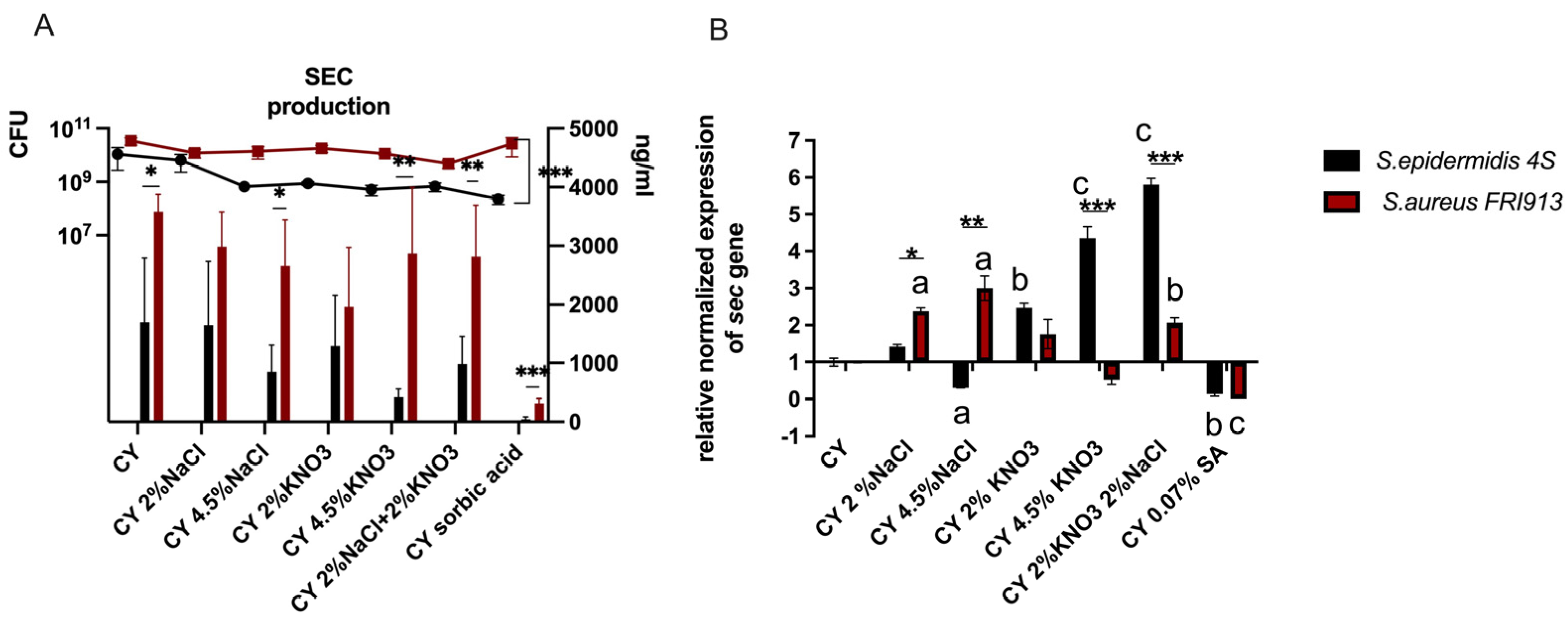 - Etter, D.; Büchel, R.; Patt, T.; Biggel, M.; Tasara, T.; Cernela, N.; Stevens, M.J.A.; Johler, S. Nitrite Stress Increases Staphylococcal Enterotoxin C Transcription and Triggers the SigB Regulon. FEMS Microbiol. Lett. 2022, 369, fnac059. [Google Scholar] [CrossRef]