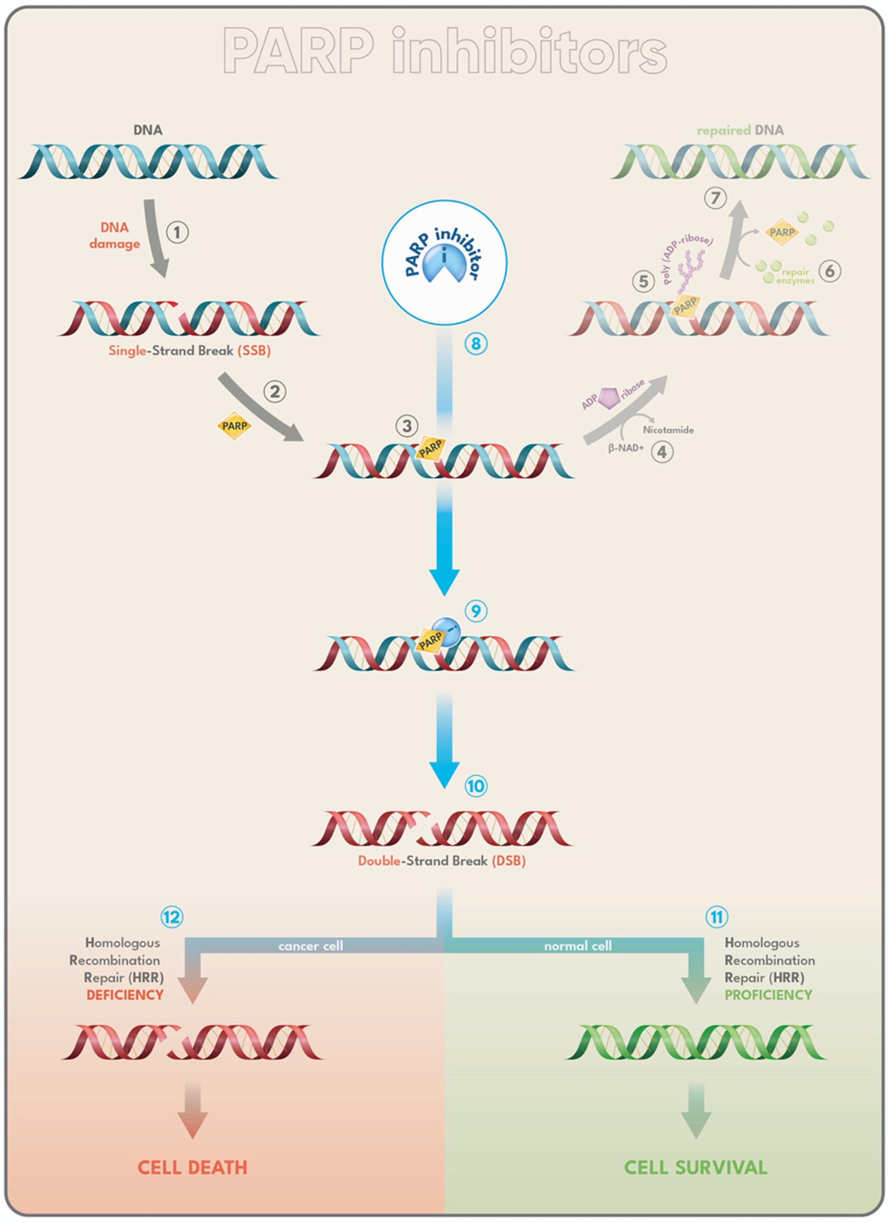 Figure 1. Mechanism of Action of PARP Inhibitors. DNA damage and PARPs. The most frequent form of DNA damage is the single-strand break (SSB) (1), which is primarily repaired through the PARP-dependent base excision repair (BER) pathway (2). Members of the PARP (Poly ADP-Ribose Polymerase) enzyme family catalyze the transfer of ADP-ribose units to target proteins. Some PARP isoforms act as sensors that detect SSBs and initiate an immediate repair response. Upon recognizing a SSB, a PARP enzyme binds to the damaged DNA site (3) and undergoes a conformational shift that enables β-NAD⁺, its required cofactor, to access the active site (4). PARP then cleaves β-NAD⁺ and transfers ADP-ribose units to target proteins, generating a poly(ADP-ribose) (PAR) chain (5). This modification promotes the recruitment of DNA repair factors via their PAR-binding domains (6), allowing the repair machinery to efficiently resolve the lesion (7). The repair process concludes with PAR degradation by Poly(ADP-ribose) Glycohydrolase (PARG) and release of PARP and associated enzymes. PARP inhibitors. PARP inhibitors (PARPi) (8) block PARP catalytic activity, preventing PARylation, and trap PARP molecules on damaged DNA (9). When SSBs cannot be repaired, they are converted into double-strand breaks (DSBs) during DNA replication, leading to additional DNA damage under PARP inhibition (10). DSBs can be repaired through homologous recombination (HR), so HR-proficient cells are able to survive by correcting these lesions (11). In contrast, HR-deficient cells—such as those harboring BRCA1 or BRCA2 mutations—cannot repair DSBs and undergo cell death (12). Because many tumors carry defects in DNA repair pathways, PARP inhibitors exploit the principle of synthetic lethality, where two individually non-lethal defects become lethal when combined.