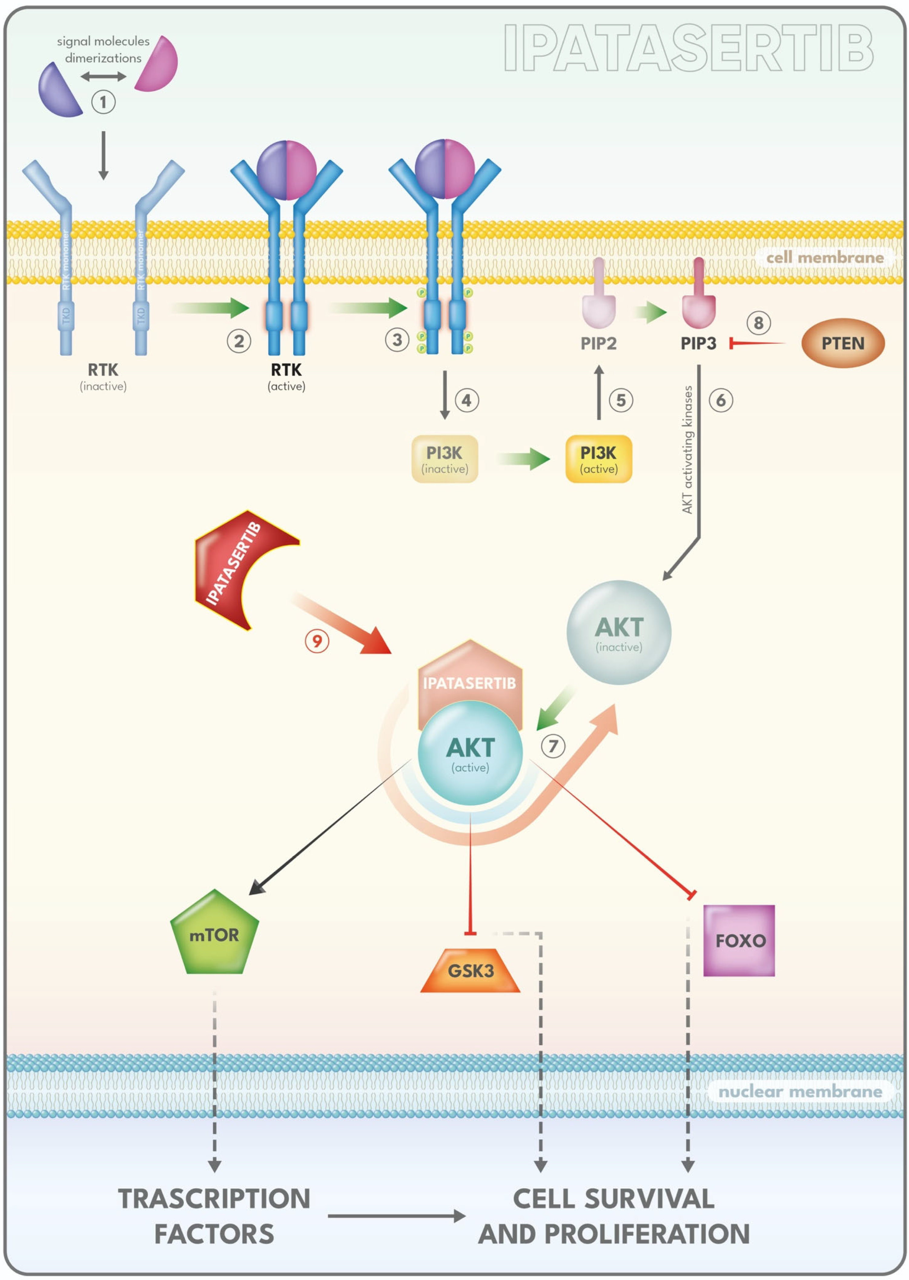 Figure 2. Mechanism of Action of Ipatasertib—PI3K/AKT Signaling Pathway. Many cancers display dysregulation of the PI3K (phosphatidylinositol 3-kinase)/AKT (also known as PKB, protein kinase B) pathway, which governs essential cellular processes such as metabolism, cell-cycle progression, survival, proliferation, motility, and differentiation. Activation of the PI3K/AKT cascade begins with stimulation of a Receptor Tyrosine Kinase (RTK). When ligands bind to the extracellular domain of the RTK (1), two receptor monomers come together to form a dimer (2). Dimerization activates the intracellular tyrosine kinase domains (TKDs), enabling each monomer to phosphorylate multiple tyrosine residues on its partner (3). These phosphotyrosines act as docking sites for downstream signaling proteins, ultimately leading to PI3K phosphorylation and activation (4). Activated PI3K converts PIP2 to PIP3 (5), which facilitates the recruitment and activation (6) of AKT. As the central effector of the pathway, activated AKT regulates numerous cellular functions (7). The pathway is negatively regulated by the tumor suppressor PTEN (8), which dephosphorylates PIP3 and restrains PI3K signaling. Mutations or alterations in PTEN, PI3K, or AKT—commonly found in various cancers—result in persistent AKT hyperactivation and uncontrolled cell growth. Ipatasertib exerts its activity by binding to the ATP-binding pocket of AKT (9), thereby inhibiting its activation and preventing downstream signaling. Through this mechanism, ipatasertib suppresses cellular proliferation and survival.