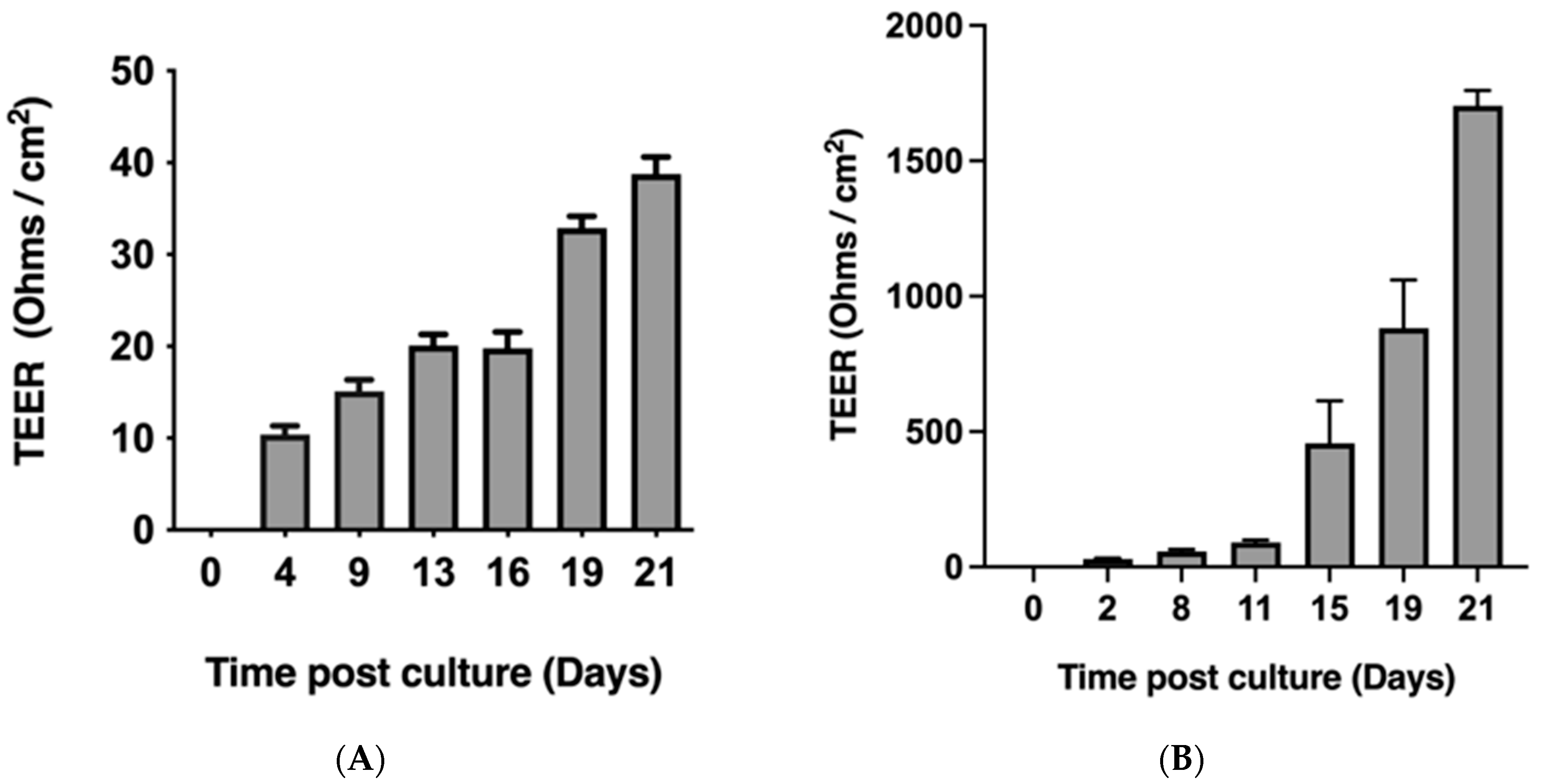 46. Srinivasan, B.; Kolli, A.R.; Esch, M.B.; Abaci, H.E.; Shuler, M.L.; Hickman, J.J. TEER measurement techniques for in vitro barrier model systems. J. Lab. Autom. 2015, 20, 107–126. [Google Scholar] [CrossRef] [PubMed]