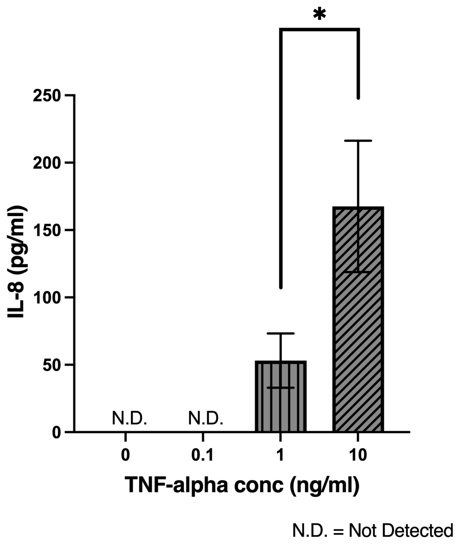 Figure 4. TNF-α induces IL-8 secretion from Caco-2 monolayers in a concentration-dependent manner. The Caco-2 monolayers were treated with increasing concentrations of TNF-α for 24 h. IL-8 protein was quantified by ELISA from the cell culture medium collected from the basal chamber of the Transwell inserts. There were at least 3 technical replicates per group. N.D indicates “not detected”, as IL-8 protein levels were below the detection threshold of the ELISA kit. Statistical analysis comparing 1 ng/mL and 10 ng/mL TNF alpha was performed using a one-tailed unpaired Student’s t-test (t(4) = 2.170, p = 0.0479). * p < 0.05.
